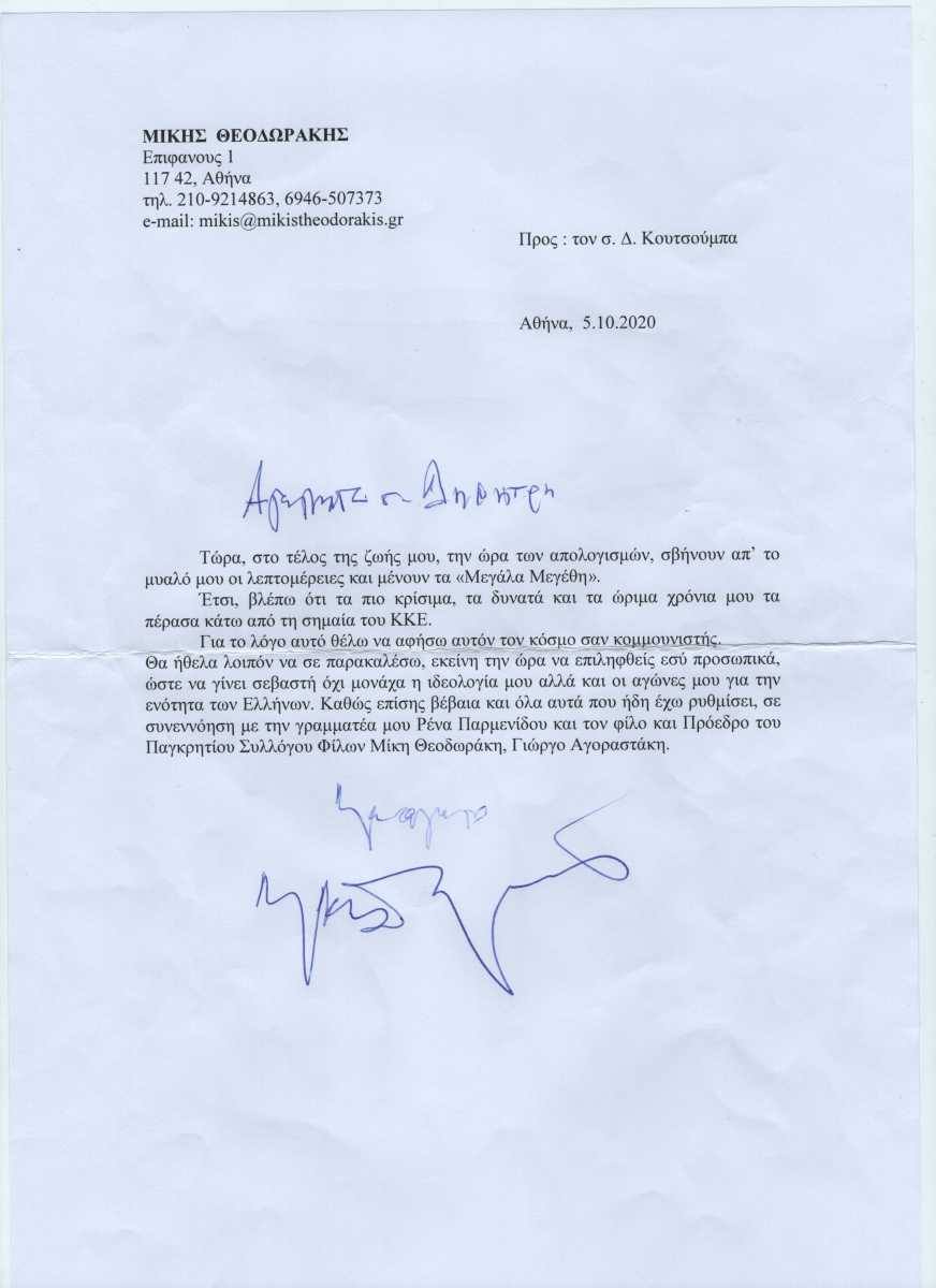 «Τώρα, στο τέλος της ζωής μου, την ώρα των απολογισμών, σβήνουν από το μυαλό μου οι λεπτομέρειες και μένουν τα “Μεγάλα Μεγέθη”. Ετσι, βλέπω ότι τα πιο κρίσιμα, τα δυνατά και τα ώριμα χρόνια μου τα πέρασα κάτω από τη σημαία του ΚΚΕ» ανέφερε μεταξύ άλλων στην επιστολή του προς τον κ. Κουτσούμπα, τον Οκτώβριο του 2020, ο Μίκης.