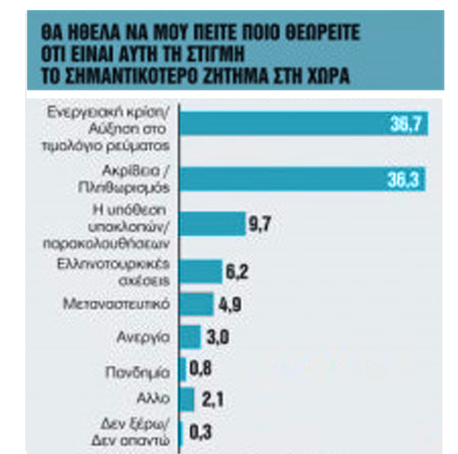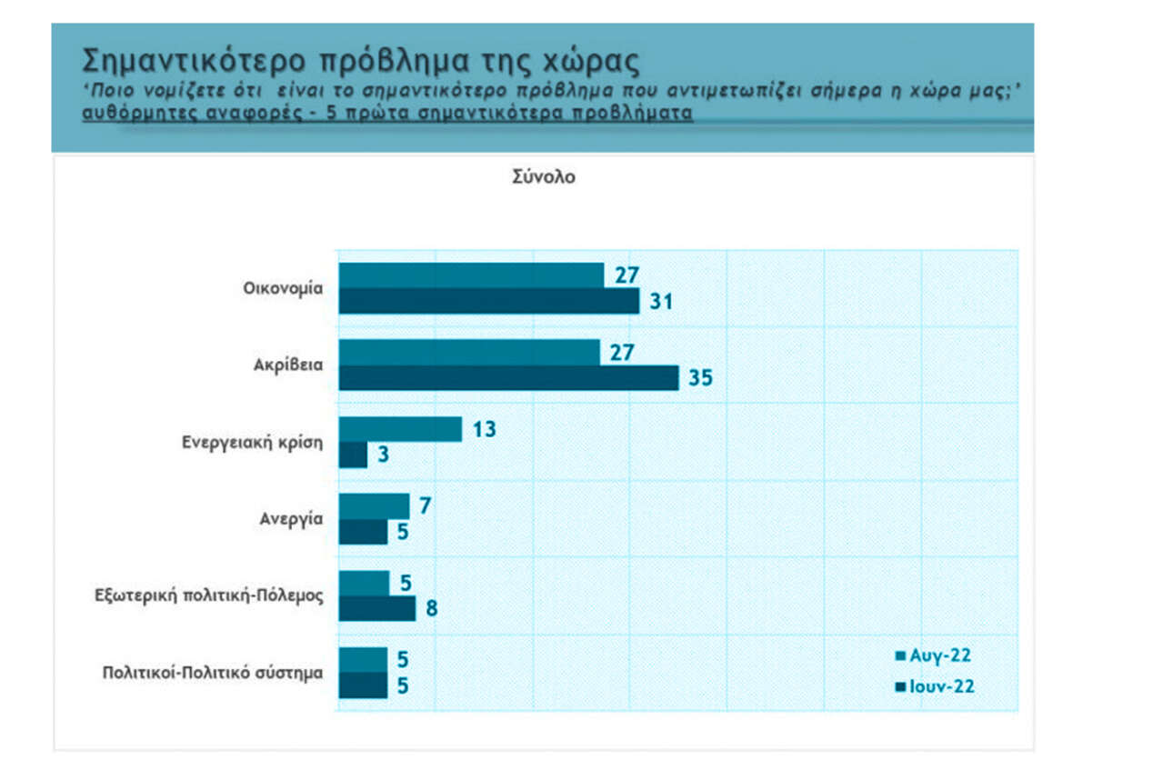 Στο ερώτημα ποιο θεωρούν οι πολίτες ως πιο σημαντικό ζήτημα για τη ζωή τους, πρώτο και στις τρεις μετρήσεις είναι το ζήτημα της οικονομίας και της ακρίβειας.