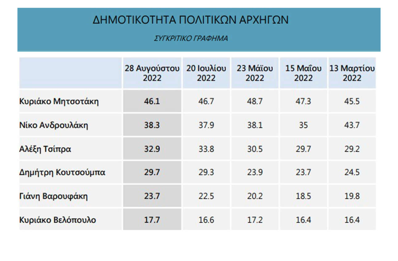 Η δημοτικότητα του Πρωθυπουργού παραμένει ηψηλή (46,1% στην έρευνα της Marc και 48,3% στην έρευνα της GPO) με δεύτερο τον κ. Ανδρουλάκη και τρίτο τον κ. Τσίπρα (με διψήφια διαφορά του κ. Τσίπρα έναντι του Πρωθυπουργού: 13,2% στην έρευνα της Marc και 11,1% σε αυτή της GPO).