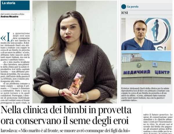 O συντάκτης της Corriere della που μεταδίδει ειδήσεις από το Κίεβο έγραψε ότι πήγε σε μια κλινική υποβοηθούμενης αναπαραγωγής και έκανε ρεπορτάζ: «Να τι μου είπε μια γυναίκα που βρήκα εκεί. ‘‘Ακόμη και αν ο άντρας μου πεθάνει στο μέτωπο, εγώ θα μπορώ να κάνω παιδιά από αυτόν. Δεν τον έχω δει από τον Φεβρουάριο’’». Και ο επικεφαλής της κλινικής, ο δρ Αλεξάντρ Ντάριι, τη συμπλήρωσε: «Η γενιά των ηρώων δεν πρέπει να εξαφανιστεί. Εμείς θα φροντίσουμε να μη συμβεί αυτό».