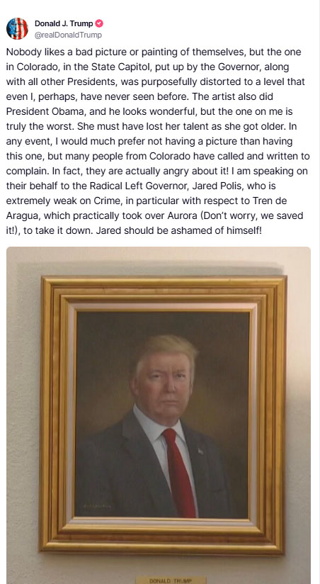 Το βράδυ της περασμένης Κυριακής ο Τραμπ σχολίασε τα πορτρέτα που ο ίδιος προτιμά και δημοσίευσε το επίσημο πορτρέτο της δεύτερης θητείας του. Σε αυτό εμφανίζεται με σφιγμένο πρόσωπο, συνοφρυωμένος και με βλέμμα αποφασιστικό. Στη δε βίλα του στο Μαρ-α-Λάγκο υπάρχει άλλο πορτρέτο του, νεανικό και με τίτλο «Ο οραματιστής», που δείχνει τον Τραμπ με λευκά σπορ ρούχα. Ο ζωγράφος που το ζωγράφισε, σχολίασαν οι Βρετανοί, είναι γνωστός για τις απεικονίσεις βασιλέων… Ο Τραμπ, γράφοντας στο TruthSocial σχετικά με το πορτρέτο του Κολοράντο, δήλωσε ότι «πολλοί άνθρωποι από το Κολοράντο παραπονέθηκαν επίσης».