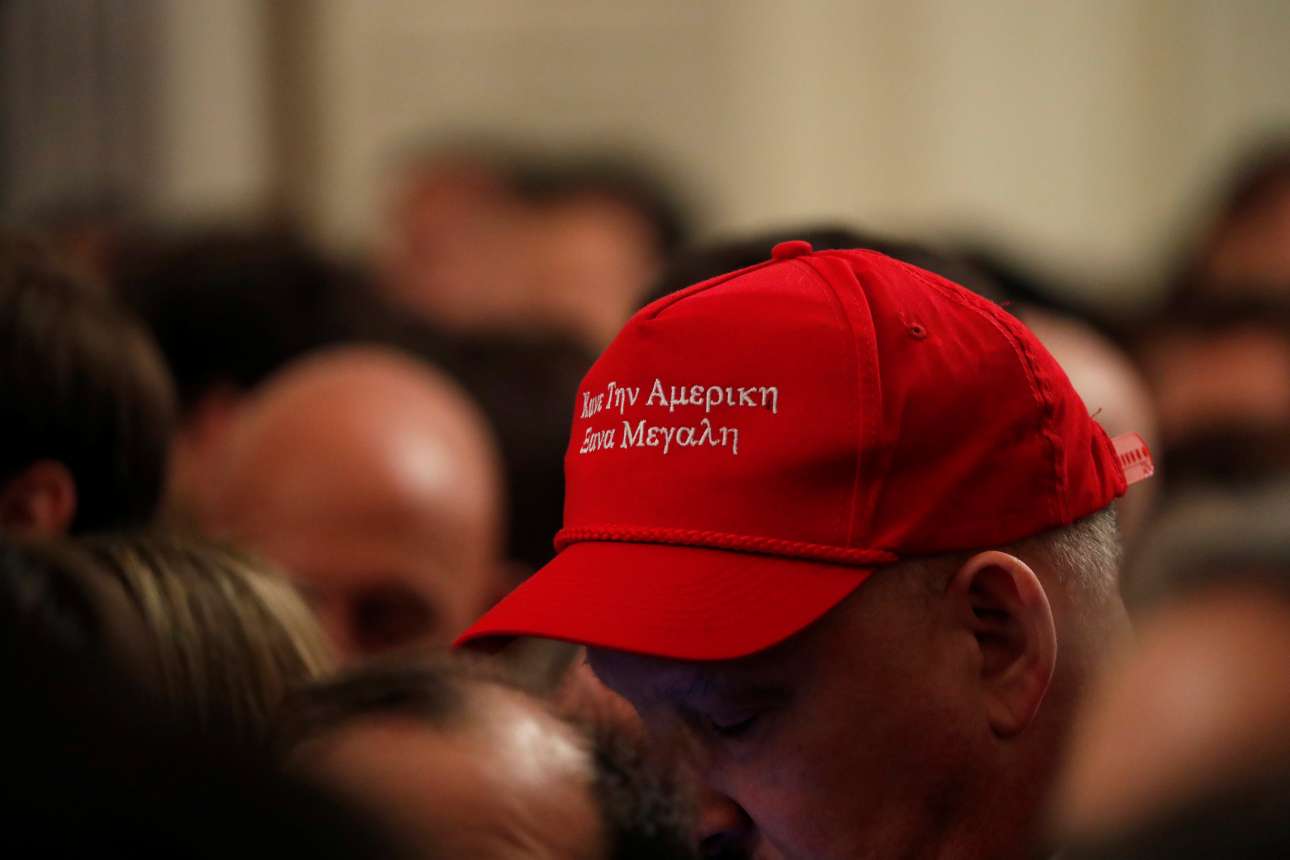 Ο αμερικανός Πρόεδρος άρχισε τον χαιρετισμό του κρατώντας ένα κόκκινο καπέλο στο οποίο αναγραφόταν στα ελληνικά «Κάντε την Αμερική μεγάλη ξανά» (το προεκλογικό του σύνθημα) και έκανε μνεία στο τρόπο με τον οποίο ο ελληνικός λαός πολέμησε για να αποκτήσει την ανεξαρτησία του.