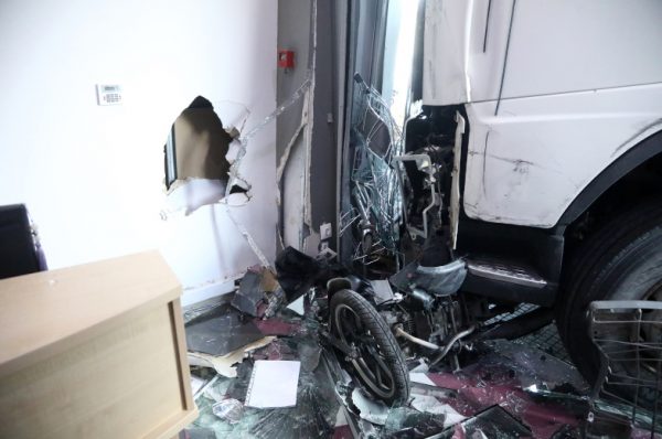 Από το τρομακτικό τροχαίο δεν υπήρξαν τραυματισμοί, το κτίριο ωστόσο όπου στεγάζεται το κατάστημα υπέστη σοβαρές υλικές ζημιές.