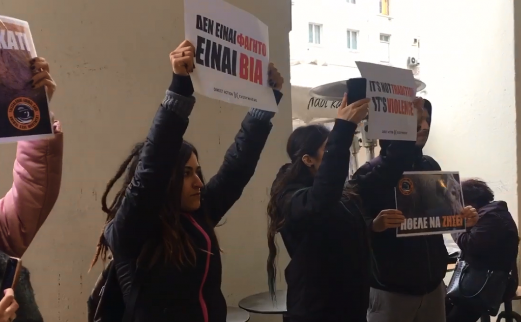 «Δεν είναι φαγητό, δεν είναι παράδοση, τα ζώα πονάνε όπως κι εμείς», έγραφαν τα πλακάτ που σηκώθηκαν έξω από μαγαζιά στον άξονα της Αριστοτέλους, την ώρα που οι σχάρες είχαν πάρει φωτιά.
