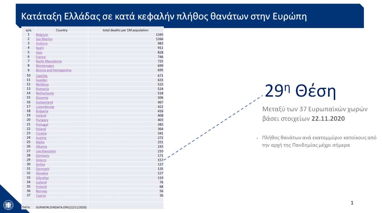 H Ελλάδα μπορεί να βρέθηκε στη 10η χειρότερη θέση με βάση τις απώλειες μόνο των τελευταίων δύο ημερών –μια απομόνωση της συνολικής εικόνας. Σε καμία περίπτωση δεν έφτασε στη 10η θέση. Μόνο με βάση τα στοιχεία για την Ευρώπη, η Ελλάδα αναλογικά με τον πληθυσμό της και από την αρχή της επιδημίας βρίσκεται στην 29η θέση.