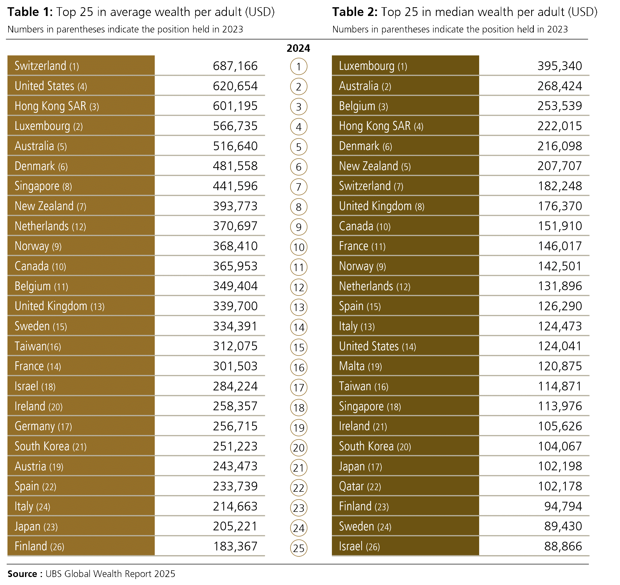 - Παρόλα αυτά, η Ελβετία συνέχισε να βρίσκεται στην κορυφή της λίστας για τον μέσο πλούτο ανά ενήλικα σε επίπεδο μεμονωμένης αγοράς, ακολουθούμενη από τις Ηνωμένες Πολιτείες (ΗΠΑ), το Χονγκ Κονγκ (SAR) και το Λουξεμβούργο.