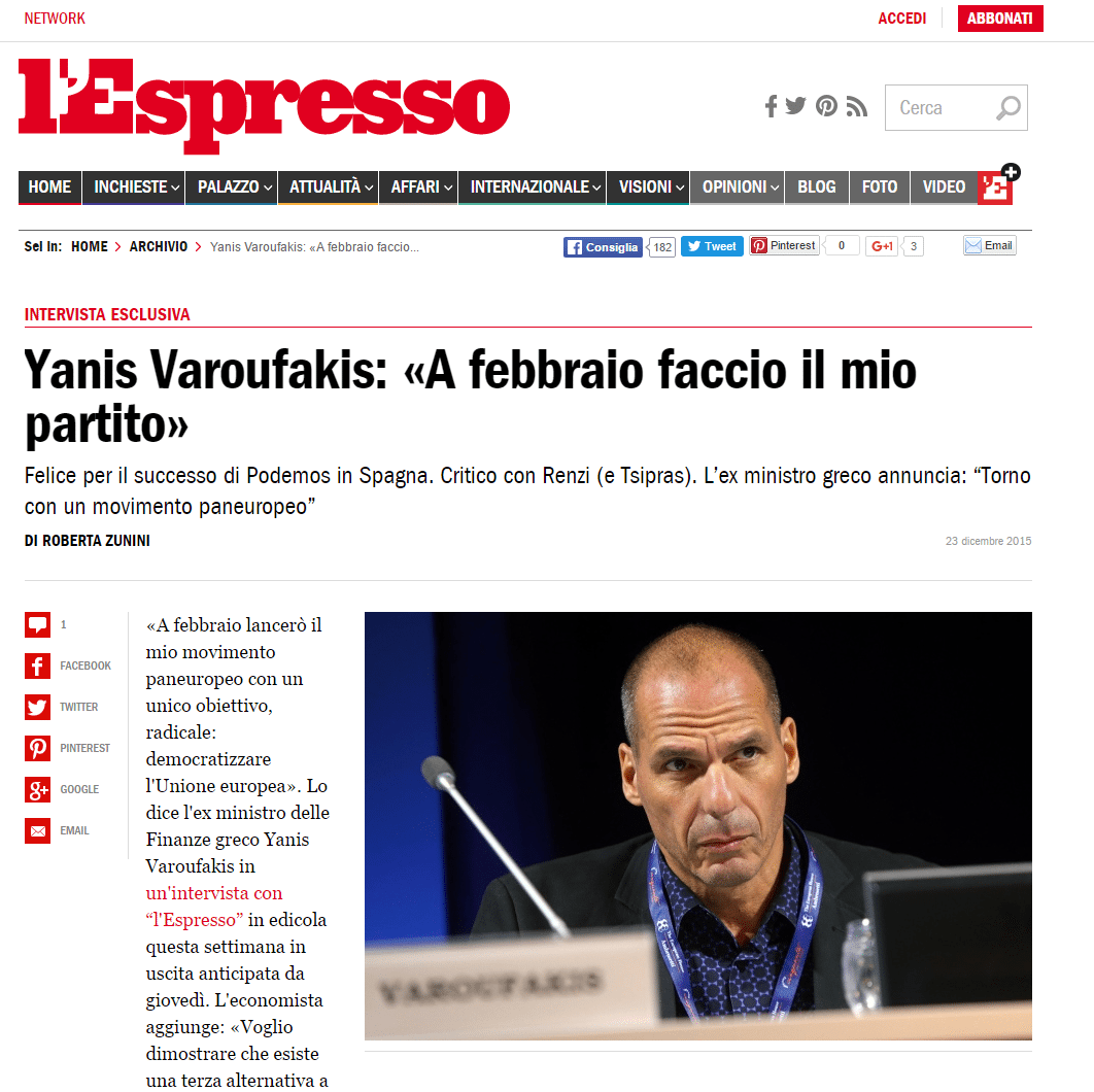 Το περιοδικό L’ Espresso κυκλοφορεί αύριο, Παραμονή Χριστουγέννων, και στα social media έχουν αρχίσει, ήδη, τα σχόλια για τη συνέντευξη του κ. Βαρουφάκη.