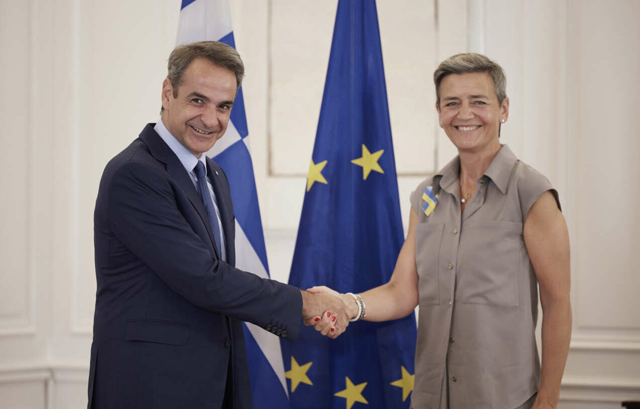 Ακολουθεί ολόκληρος ο διάλογος του Πρωθυπουργού με την εκτελεστική αντιπρόεδρο της Ευρωπαϊκής Επιτροπής (ανεπίσημη μετάφραση από τα αγγλικά):*Κυριάκος Μητσοτάκης: Χαίρομαι πολύ που σας ξαναβλέπω. Υπάρχουν πολλά να συζητήσουμε, αλλά πρέπει να πω ότι έχουμε σημειώσει σημαντική πρόοδο ως χώρα από την τελευταία φορά που συναντηθήκαμε. Όπως γνωρίζετε, το καθεστώς Ενισχυμένης Εποπτείας θα λήξει τον Αύγουστο. Όλοι δουλέψαμε σκληρά για να διασφαλίσουμε ότι αυτό το πολύ οδυνηρό κεφάλαιο για τη χώρα, που ξεκίνησε πριν από 12 χρόνια, έφτασε στο τέλος του.Πιστεύω επίσης ότι έχουμε σημειώσει μεγάλη πρόοδο σε διάφορα θέματα του πεδίου των ενδιαφερόντων σας και θα ήθελα να ευχαριστήσω εσάς προσωπικά, αλλά και τις υπηρεσίες σας. Θεωρώ ότι έχουμε μια πολύ καλή και ειλικρινή συνεργασία. Αλλά και όσον αφορά την ψηφιοποίηση, που ξέρω ότι είναι το μεγάλο σας πάθος, πιστεύω ότι έχουμε κάνει πολλά στην Ελλάδα σε αυτό τον τομέα.Χρησιμοποιήσαμε τον Covid ως «επιταχυντή» για να προωθήσουμε σημαντικά τις ψηφιακές υπηρεσίες, με πρωτοφανή ρυθμό, αλλά φυσικά απομένουν πολλά να γίνουν ακόμη όσον αφορά τις ψηφιακές υποδομές. Ξέρω ότι είχατε επίσης μια εποικοδομητική συνάντηση με τον Υπουργό Επικρατείας και Ψηφιακής Διακυβέρνησης Κυριάκο Πιερρακάκη και προσβλέπουμε να χρησιμοποιήσουμε τα κεφάλαια του Ταμείου Ανάκαμψης για να προωθήσουμε περαιτέρω τον ψηφιακό μετασχηματισμό.Και φυσικά, θα ήθελα επίσης να σας συγχαρώ για την ηγεσία σας αναφορικά με τις ευρωπαϊκές πρωτοβουλίες που έχουμε αναλάβει στον ψηφιακό τομέα. Είναι σημαντικό να υπάρχει ένα πρωτοποριακό ρυθμιστικό καθεστώς δημόσιας πολιτικής που ξεκινάει από την Ευρώπη. Όταν μιλάμε για μεγάλες εταιρείες τεχνολογίας, με όλα τα οφέλη που προκύπτουν, πρέπει να αναγνωρίσουμε ότι υπάρχει και μια άλλη πλευρά στην οποία πρέπει να δώσουμε προσοχή. Τα προσωπικά μου συγχαρητήρια για την ανεξάντλητη ενέργεια με την οποία επενδύετε σε αυτόν τον πολύ σημαντικό τομέα.Margrethe Vestager: Σας ευχαριστώ πολύ. Εκτιμώ πολύ που το λέτε αυτό, γιατί όλα εξαρτώνται από την ομαδική δουλειά. Πολλοί άνθρωποι αφοσιώθηκαν στον ψηφιακό τομέα για να πραγματοποιηθεί αυτή η δουλειά τα προηγούμενα χρόνια. Το ίδιο ισχύει, πιστεύω, και για όλη την βοήθεια που χρειαζόταν κατά τη διάρκεια της πανδημίας. Η ομάδα εργάζεται 24 ώρες, 7 μέρες την εβδομάδα και πιστεύω ότι συνεργάζεται πολύ καλά με τους συναδέλφους μας εδώ στην Ελλάδα. Άρα, η υλοποίηση του στόχου οφείλεται στη δουλειά των ομάδων.Είναι λίγο-πολύ μια επίσκεψη για να σας συγχαρούμε γιατί αυτό που πέτυχε η Ελλάδα τα τελευταία χρόνια είναι πραγματικά εντυπωσιακό. Kαι βρισκόμαστε σε αυτή την πολύπλευρη κρίση πολέμου, ενέργειας, πληθωρισμού, κλίματος που δυστυχώς φέρνει σε δεύτερη μοίρα την εορταστική ατμόσφαιρα που θα έπρεπε να συνοδεύει το τέλος της Ενισχυμένης Εποπτείας.Αυτό επετεύχθη -ήμουν παρούσα και το παρακολούθησα από πρώτο χέρι- και μάλιστα τότε πολλοί αμφισβητούσαν κατά πόσον αυτό ήταν εφικτό, αν θα μπορούσε να πραγματοποιηθεί. Όταν τελικά έρχεται η επιτυχία έχει «πολλούς πατέρες». Πιστεύω πως η δική σας κυβέρνηση έχει κάθε δικαίωμα να το κάνει, γιατί δούλεψε σκληρά για να πραγματοποιηθεί αυτό. Δεν θα πρέπει, όμως, να παραβλέψουμε τον πόνο και τις θυσίες του ελληνικού λαού μέχρι να φτάσουμε εδώ, γιατί ήταν πράγματι μια επώδυνη διαδικασία.Είναι επώδυνο να διορθωθεί μια οικονομική π