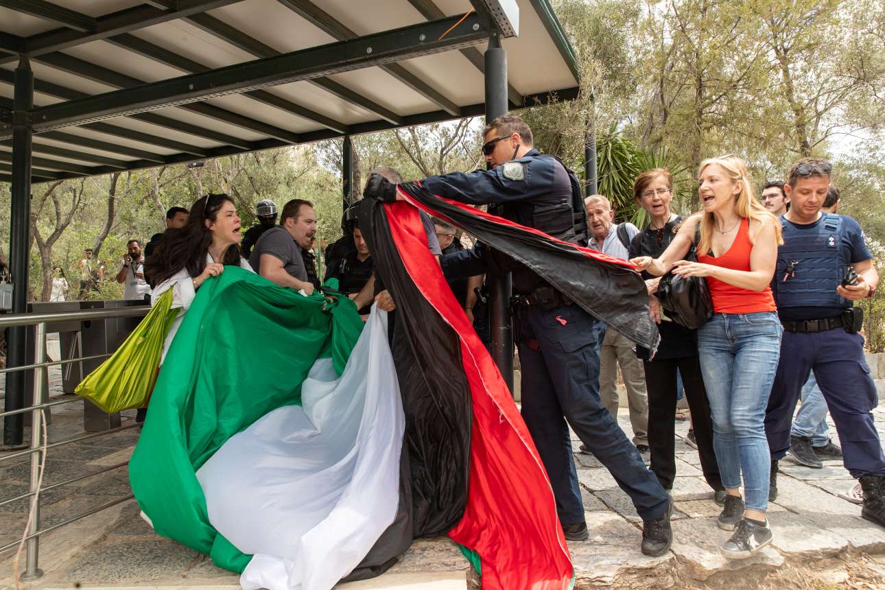 Δώδεκα άτομα -μέλη της Νέας Αριστεράς και της Νεολαίας του κόμματος- προσήχθησαν από την Ελληνική Αστυνομία, έπειτα από μία ακόμη επεισοδιακή διαμαρτυρία για τη Γάζα στην Ακρόπολη, που συνοδεύτηκε -κατά σχεδόν πάγια τακτική σε αντίστοιχες ακτιβιστικές ενέργειες- με την ανάρτηση της παλαιστινιακής σημαίας στα τείχη.