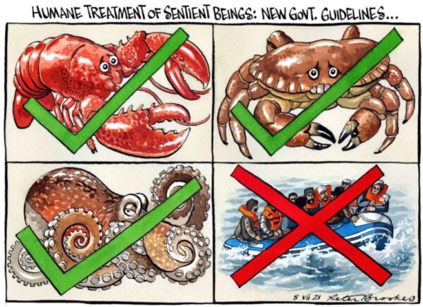 Το δικό του σχόλιο για όλα τα παραπάνω έκανε στους λονδρέζικους Times της Πέμπτης 8 Ιουλίου ο βετεράνος σκιτσογράφος Πίτερ Μπρουκς, δένοντας τα θαλάσσια μαλάκια με τους τριτοκοσμικούς υποψήφιους μετανάστες, αν και στο Νησί η μετανάστευσή τους δεν γίνεται με αποβατικά σκάφη όπως στην Ελλάδα και στην Ιταλία. Το κάδρο του χωρίζεται σε τέσσερα καρέ. Στα πρώτα τρία εικονίζονται τα μαλάκια που θα ευργετηθούν από την ευαισθησία των Τόρις προτού καταλήξουν στα ευγενή στομάχια των πλουσίων ψηφοφόρων τους. Στο τέταρτο εικονίζεται ένα φουσκωτό σε φουρτούνα, με στοιβαγμένους εντός του ανθρώπους φέροντες σωσίβια.