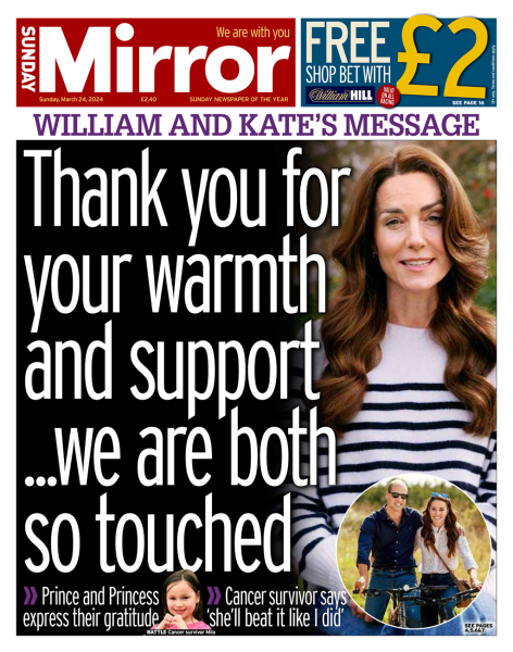 «Ο πρίγκιπας και η πριγκίπισσα είναι και οι δύο πάρα πολύ συγκινημένοι από τα μηνύματα συμπαράστασης (που έχουν σταλεί) από πολίτες από τη Βρετανία, την Κοινοπολιτεία και από ολόκληρο τον κόσμο», μετά το βίντεο της Κέιτ, στο οποίο ανακοίνωσε πως πάσχει από καρκίνο, δήλωσε εκπρόσωπος Τύπου του Κένσινγκτον.