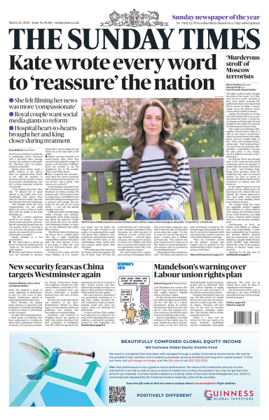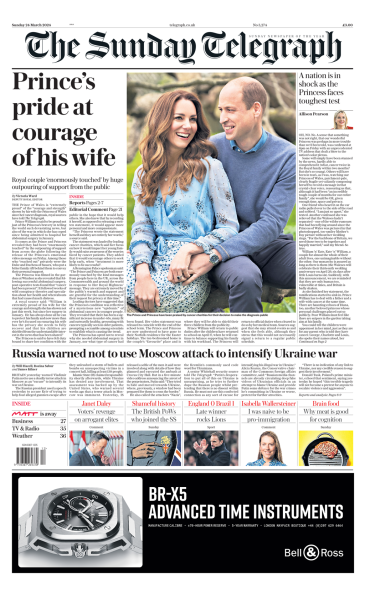 Η Sunday Telegraph επέλεξε να κοσμήσει το πρωτοσέλιδό της με μια φωτογραφία της Κέιτ και του Γουίλιαμ, σημειώνοντας στον τίτλο «η υπερηφάνεια του πρίγκιπα μπροστά στο θάρρος της συζύγου του».