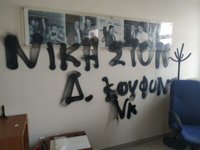 «Οι υποστηρικτές του κατά συρροή δολοφόνου Δ. Κουφοντίνα συνεχίζουν να προκαλούν κάθε δημοκρατικό πολίτη με τις τραμπούκικες ενέργειές τους. Σήμερα στόχος τους ήταν τα γραφεία της Νέας Δημοκρατίας Χανίων και το πατρικό σπίτι του Πρωθυπουργού στα Χανιά.