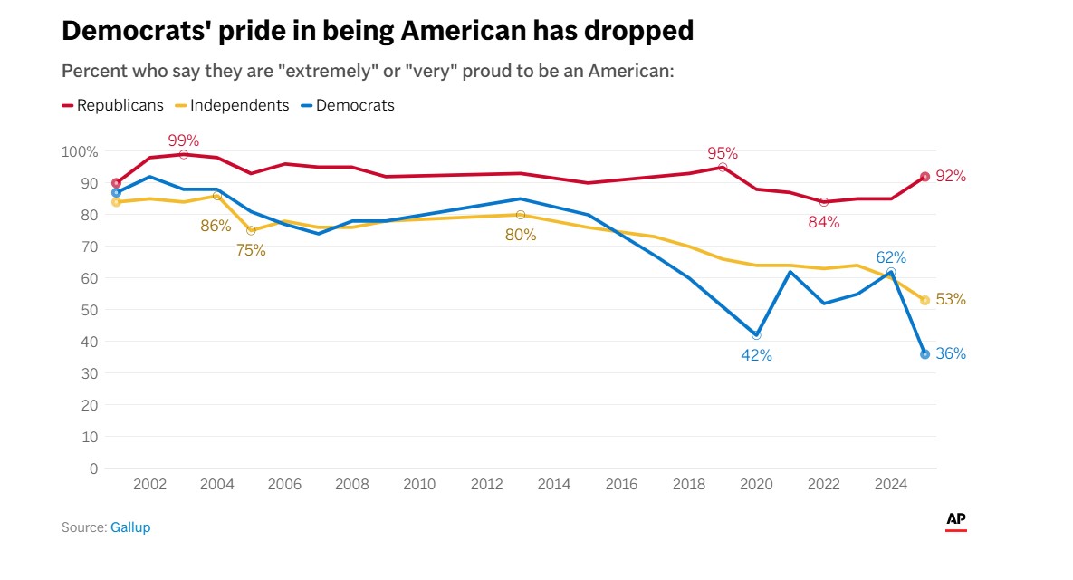 Η μειωμένη εθνική υπερηφάνεια των Δημοκρατικών συνδέεται σαφώς με την θητεία του Τραμπ. Οταν ο Τραμπ εκλέχθηκε για πρώτη φορά το 2017, περίπου τα δύο τρίτα των Δημοκρατικών δήλωναν ότι ήταν υπερήφανοι που ήταν Αμερικανοί. Το ποσοστό αυτό είχε μειωθεί στο 42% το 2020, λίγο πριν ο Τραμπ χάσει την επανεκλογή του από τον Δημοκρατικό Τζο Μπάιντεν.