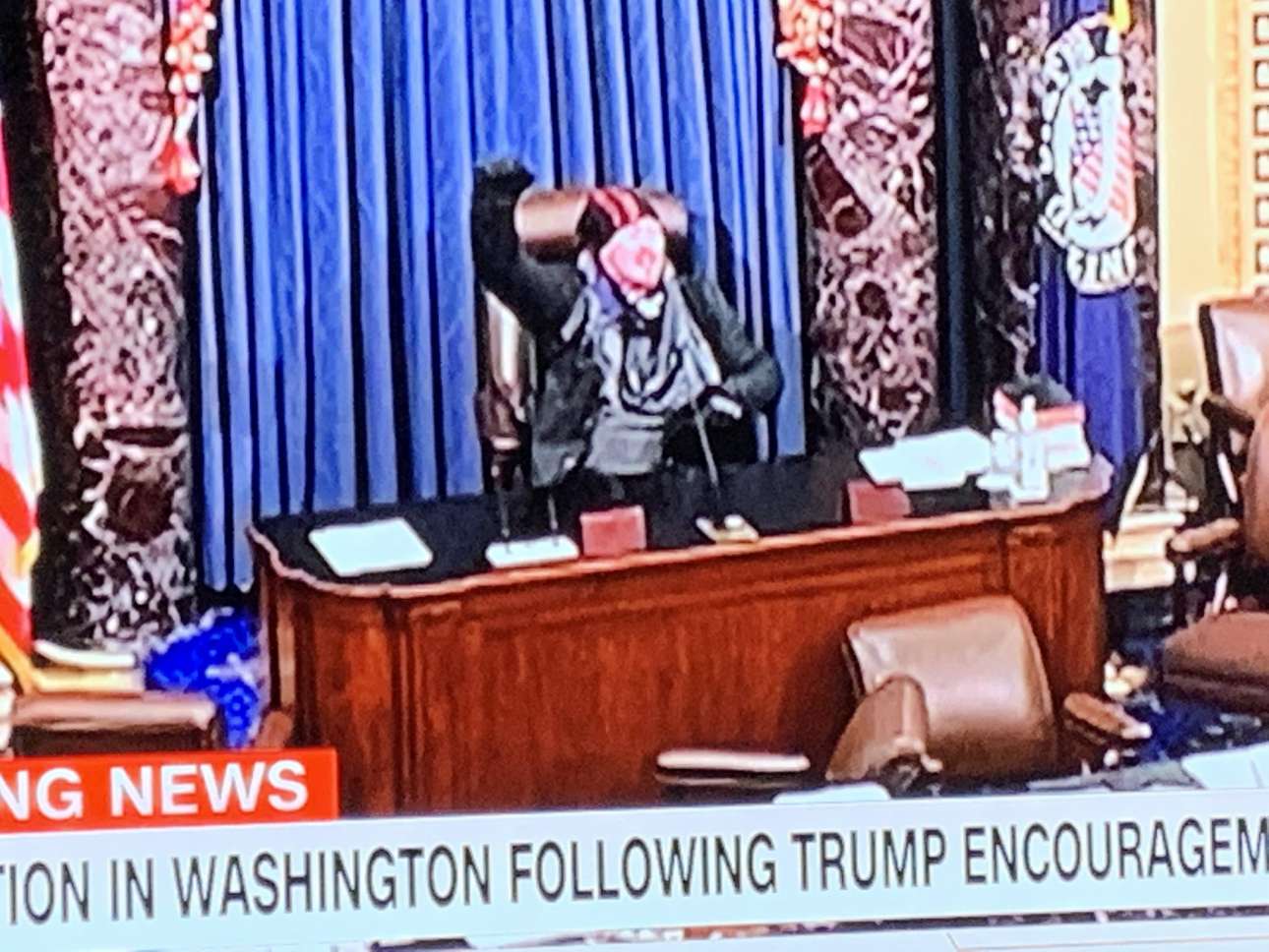 Πολλοί εισέβαλαν στα γραφεία γερουσιαστών και βουλευτών, που είχαν εκκενωθεί βιαστικά —με τους υπολογιστές ακόμα ανοιχτούς, ένας εφιάλτης για την ασφάλεια των ΗΠΑ, που θα μας απασχολήσει σύντομα. Κάποιοι ποζάριζαν περήφανοι στο γραφείο της προέδρου της Βουλής των Αντιπροσώπων Νάνσι Πελόζι και σε άλλα γραφεία γερουσιαστών, άλλοι καβάλησαν αγάλματα τέως προέδρων. Ενας εμφανίστηκε με τη σημαία των Νοτίων από τον αμερικανικό εμφύλιο —ουδέποτε στην ιστορία αυτού του εμβληματικού κτιρίου δεν είχε υψωθεί αυτό το σύμβολο των φυλετικών διακρίσεων στους χώρους του.