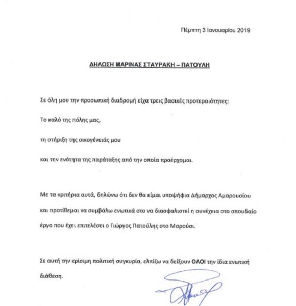 Η ανακοίνωση της Μαρίνας Πατούλη έχει ως εξής: