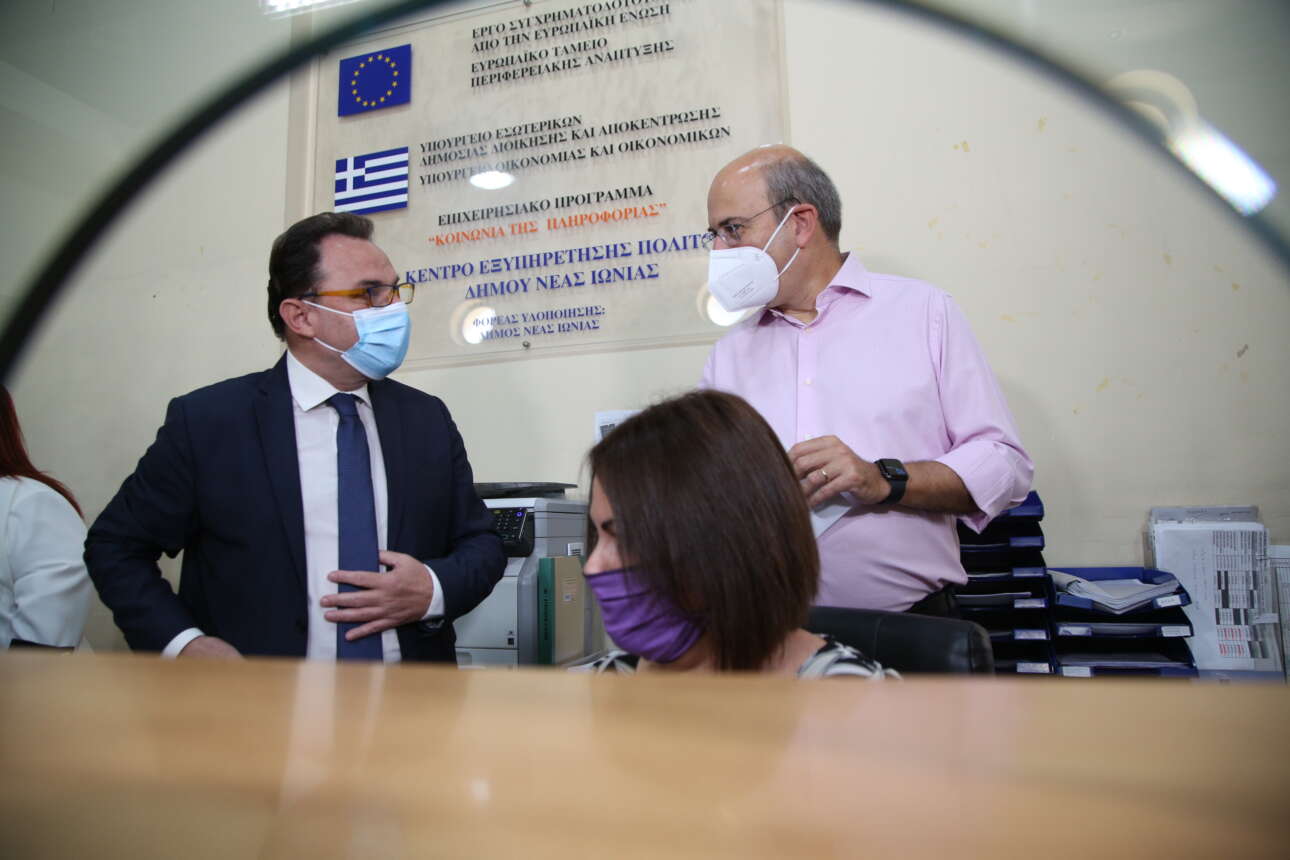 Επίσκεψη στο Κέντρο Εξυπηρέτησης Πολιτών (ΚΕΠ) Νέας Ιωνίας πραγματοποίησαν την Πέμπτη ο υπουργός Εργασίας και Κοινωνικών Υποθέσεων Κωστής Χατζηδάκης και ο υφυπουργός Ψηφιακής Διακυβέρνησης Γιώργος Γεωργαντάς προκειμένου να δουν από κοντά την λειτουργία των ψηφιακών υπηρεσιών του e-ΕΦΚΑ που διεκπεραιώνονται μέσω των ΚΕΠ.