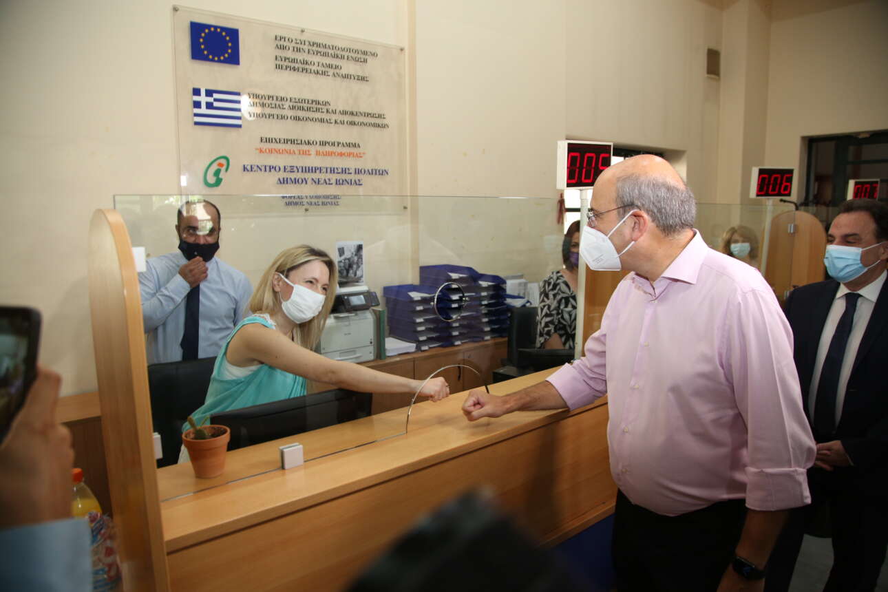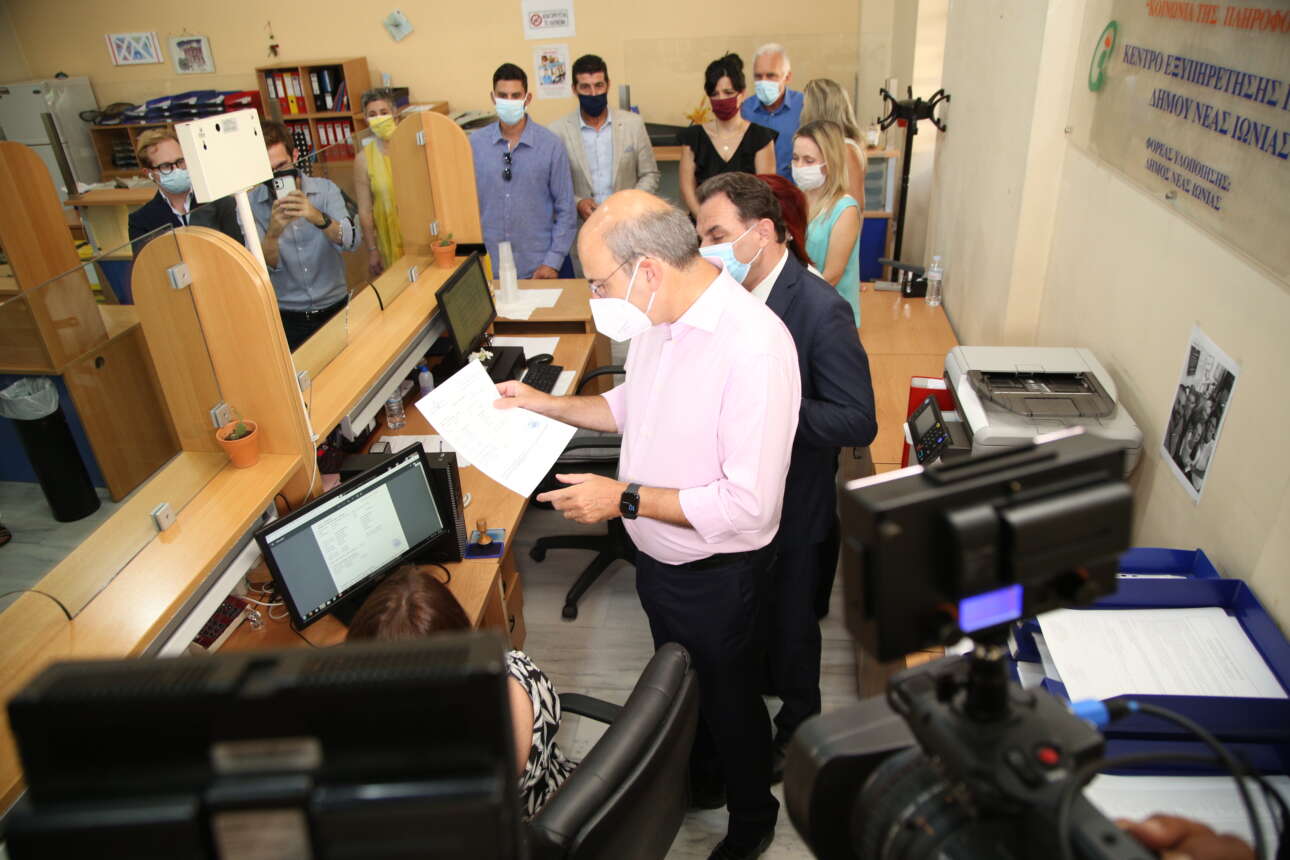 Επίσκεψη στο Κέντρο Εξυπηρέτησης Πολιτών (ΚΕΠ) Νέας Ιωνίας πραγματοποίησαν την Πέμπτη ο υπουργός Εργασίας και Κοινωνικών Υποθέσεων Κωστής Χατζηδάκης και ο υφυπουργός Ψηφιακής Διακυβέρνησης Γιώργος Γεωργαντάς προκειμένου να δουν από κοντά την λειτουργία των ψηφιακών υπηρεσιών του e-ΕΦΚΑ που διεκπεραιώνονται μέσω των ΚΕΠ.