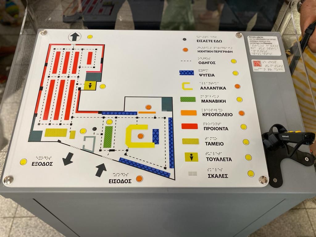 Ο κ. Χατζηδάκης περιηγήθηκε στο κατάστημα, το οποίο υλοποιήθηκε σε συνεργασία με το Εθνικό Κέντρο Ερευνας και Τεχνολογικής Ανάπτυξης (ΕΚΕΤΑ), το παράρτημα Θεσσαλονίκης του Κέντρου Εκπαίδευσης και Αποκατάστασης Τυφλών (ΚΕΑΤ) και την εταιρεία TANDEM και ενημερώθηκε για τους τρόπους με τους οποίους εξασφαλίζεται –με τη χρήση της τεχνολογίας- η ασφαλής περιήγηση των καταναλωτών με οπτική αναπηρία στον χώρο και διευκολύνονται οι καταναλωτές κατά τη διαδικασία επιλογής προϊόντων από το ράφι.