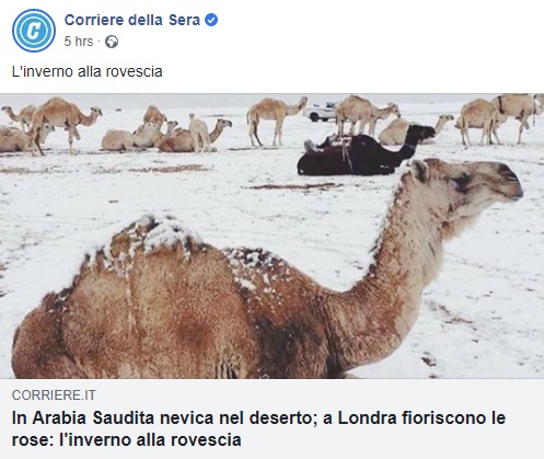 Και δεν είναι τόσο είδηση ότι στο καταχείμωνο χιονίζει στον αμμόλοφο, τέτοιο παράδοξο είναι σπανιότατο μεν, όχι όμως και πρωτοφανές. Σε συνδυασμό με ό,τι συμβαίνει στην Ευρώπη σοκάρει η αραβική χιονόπτωση: νιφάδες πέφτουν δίπλα στις πετρελαιοπηγές, ενώ έχουμε ανθοφορία των ρόδων στο Λονδίνο και των ροδακίνων στην Ισπανία, όπως και αιθρία στην Ιταλία και στα Βαλκάνια.