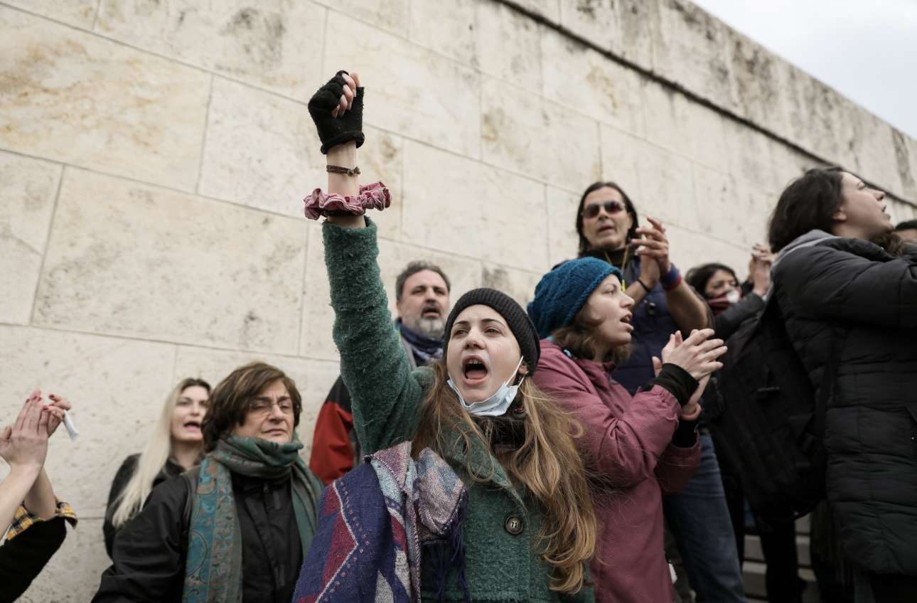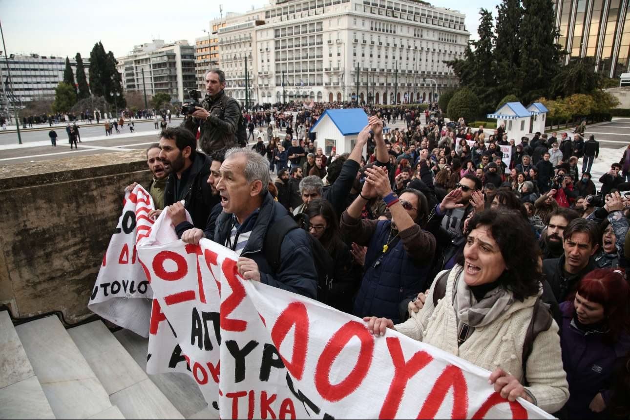 Οι διαδηλωτές κινήθηκαν προς το περιστύλιο της Βουλής, μπροστά από το οποίο είχαν παραταχθεί ισχυρές αστυνομικές δυνάμεις.
