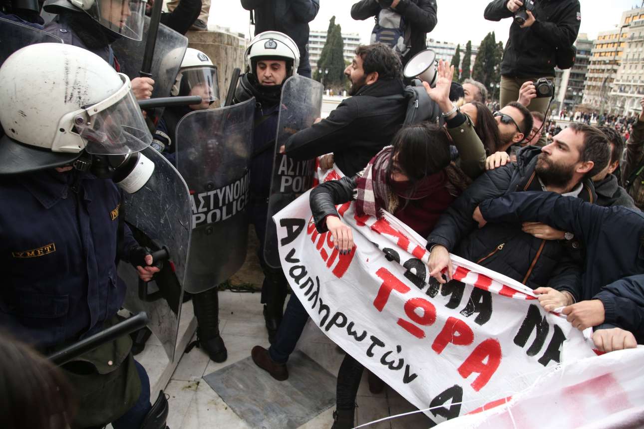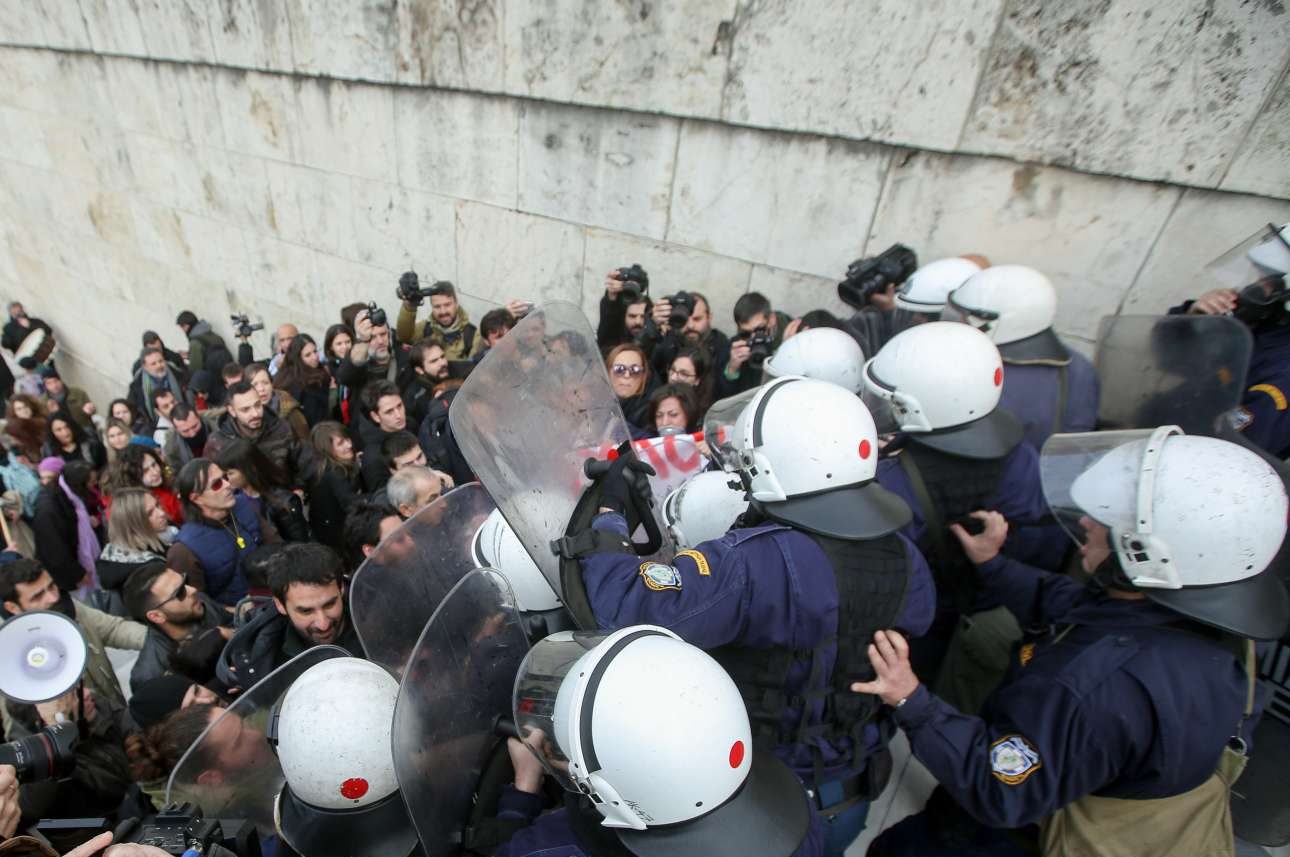 Επεισόδια σημειώθηκαν την Παρασκευή έξω από τη Βουλή κατά τη διάρκεια πορείας εκπαιδευτικών, οι οποίοι επιχείρησαν να σπάσουν τον κλοιό των αστυνομικών.