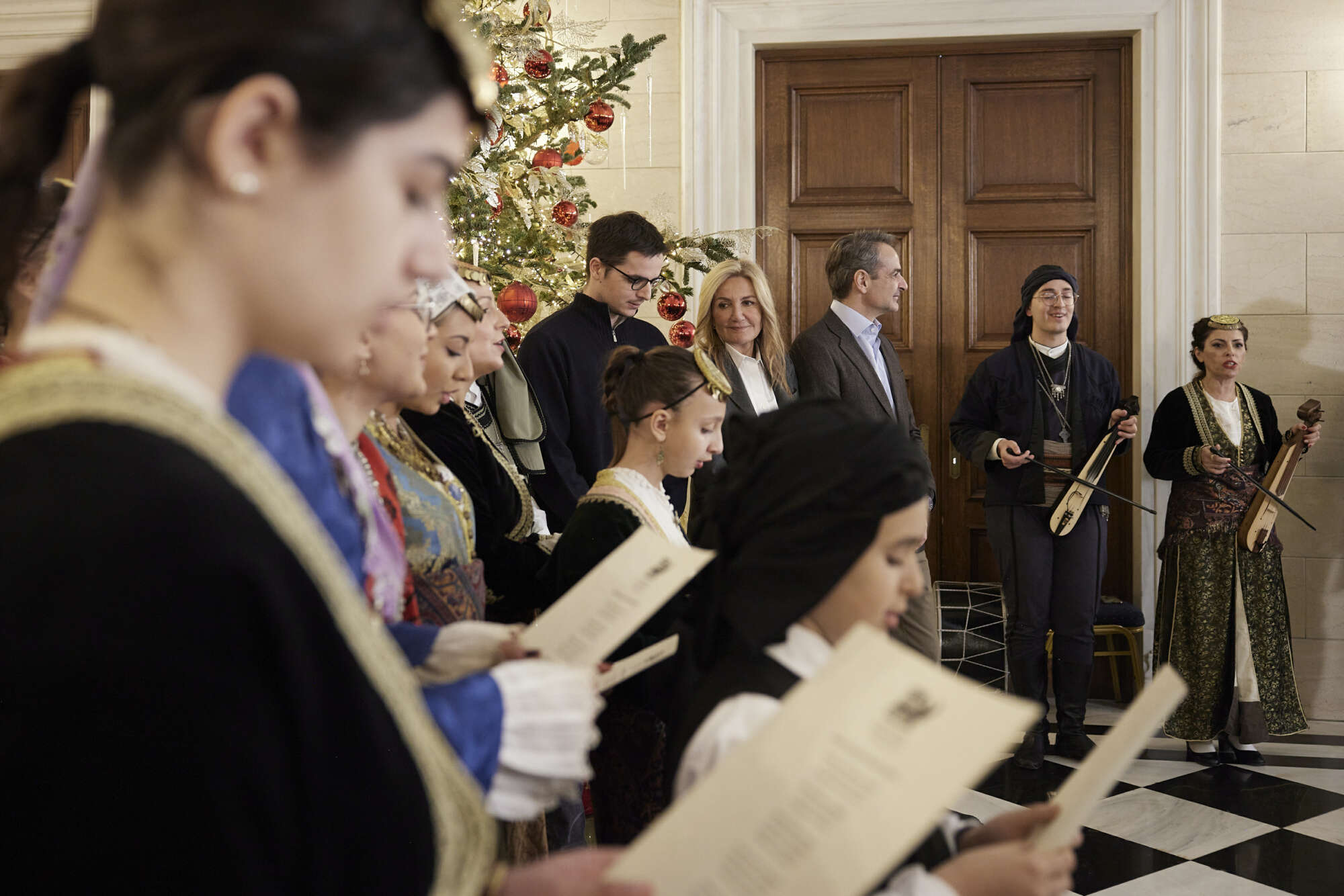 Χριστουγεννιάτικα κάλαντα από διάφορες περιοχές της Ελλάδας άκουσαν στο Μέγαρο Μαξίμου το Σάββατο ο Πρωθυπουργός Κυριάκος Μητσοτάκης, η σύζυγός του Μαρέβα-Γκραμπόφκσι Μητσοτάκη και τα παιδιά τους Κωνσταντίνος και Δάφνη.