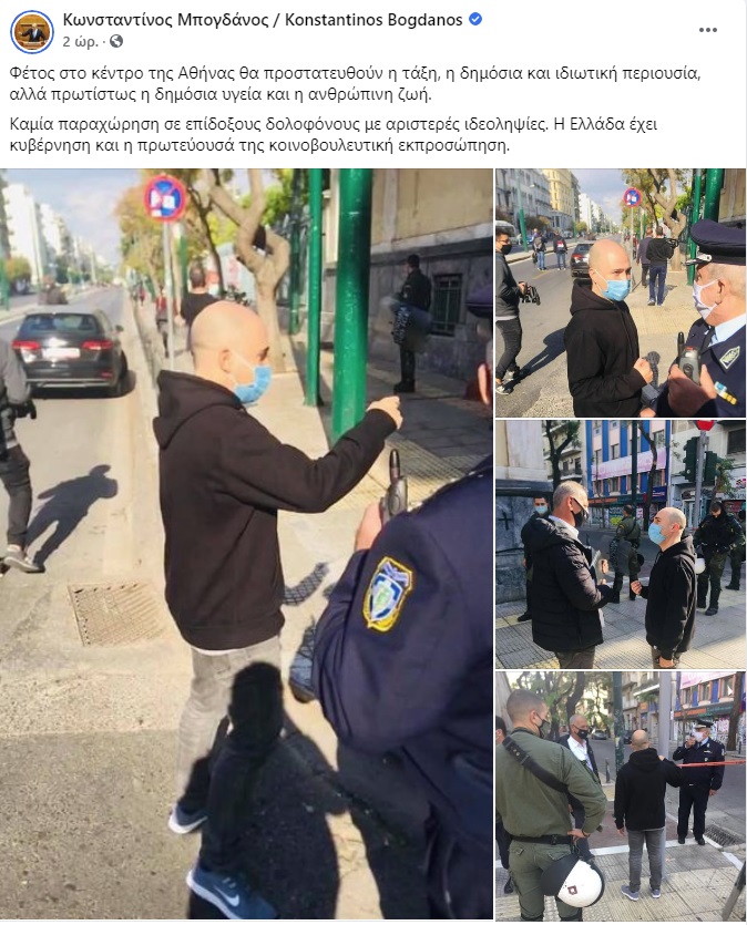 Στο μεταξύ, (μικρο)πολιτικό ενδιαφέρον έχει η εμφάνιση στην περιοχή του Πολυτεχνείου του Κωνσταντίνου Μπογδάνου, βουλευτή Α’ Αθήνας της Νέας Δημοκρατίας, ο οποίος με casual ντύσιμο συνομίλησε με στελέχη της ΕΛ.ΑΣ και φρόντισε να αναρτήσει την παρουσία του στα social media. Εγραψε μάλιστα ότι «εφέτος στο κέντρο της Αθήνας θα προστατευθούν η τάξη, η δημόσια και ιδιωτική περιουσία, αλλά πρωτίστως η δημόσια υγεία και η ανθρώπινη ζωή. Καμία παραχώρηση σε επίδοξους δολοφόνους με αριστερές ιδεοληψίες. Η Ελλάδα έχει κυβέρνηση και η πρωτεύουσά της κοινοβουλευτική εκπροσώπηση».