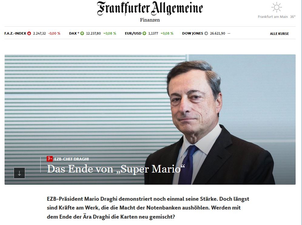 Το άρθρο του Γκέραλντ Μπράουνμπέργκερ, ενός εκ των συνεκδοτών της Frankfurter Allgemeine Zeitung κάνει ιδιαίτερη μνεία στο περίφημο «whatever it takes» που είχε εκστομίσει ο Ντράγκι στις 26 Ιουλίου του 2012 -μια εκπεφρασμένη δέσμευση του προέδρου της ΕΚΤ να κάνει «ό,τι είναι αναγκαίο» για τη διάσωση του ενιαίου νομίσματος που αποκατέστησε την εμπιστοσύνη των αγορών και συνέβαλε στην αποφασιστική αντιμετώπιση της κρίσης χρέους της ευρωζώνης.