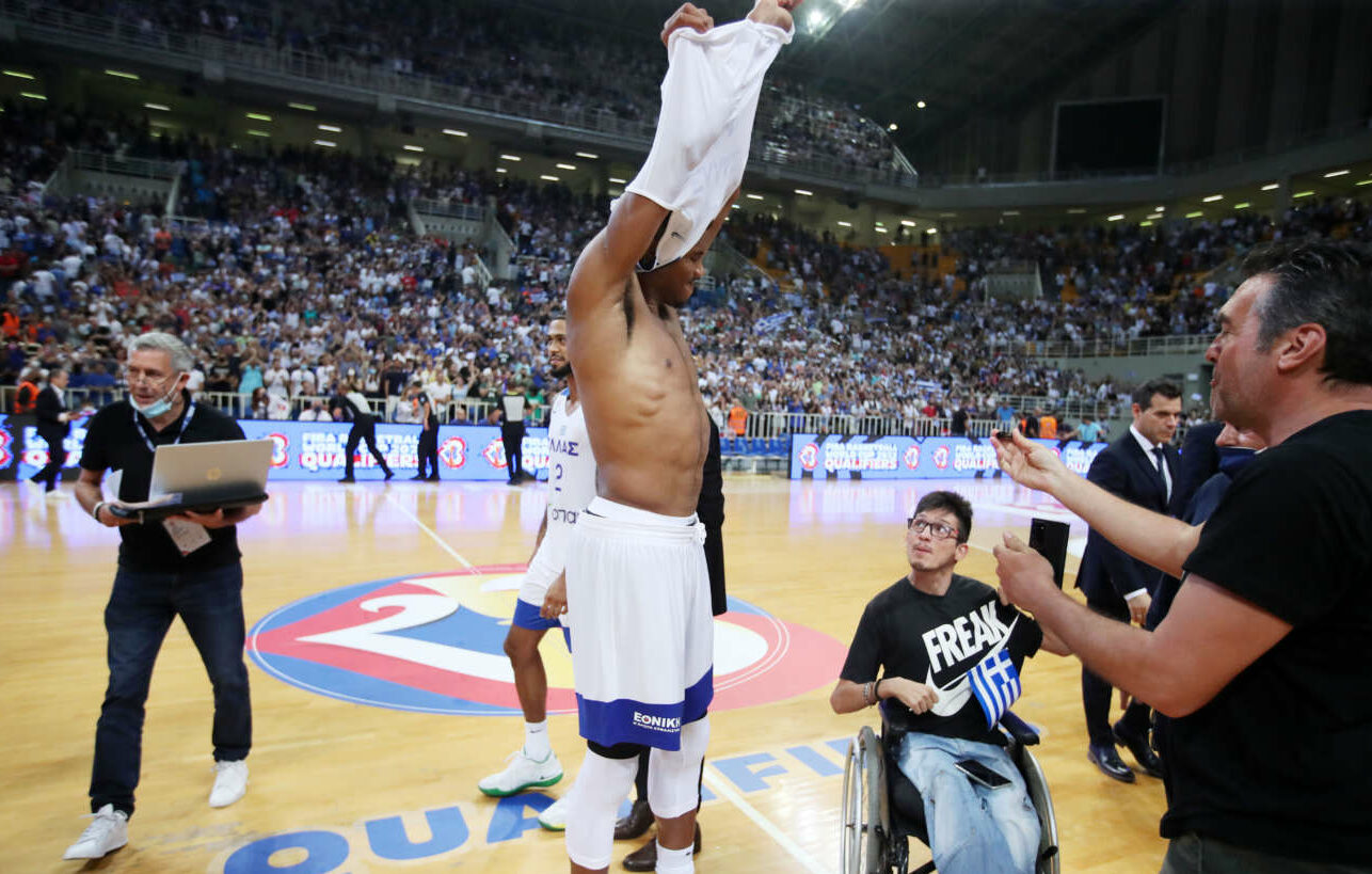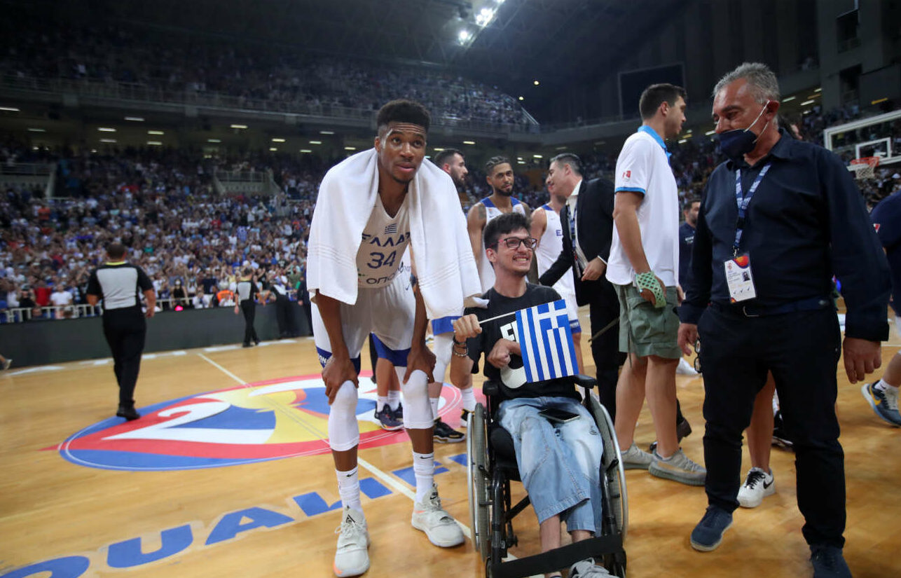 Μετά την κόρνα της λήξης και εν μέσω γενικής αποθέωσης, ο 27χρονος σούπερ σταρ του NBA ξεχώρισε από τους 19.443 φιλάθλους που κατέκλυσαν το κλειστό του ΟΑΚΑ –ρεκόρ προσέλευσης για αγώνα Εθνικής– έναν ΑμεΑ φίλαθλο. Τον πλησίασε, φωτογραφήθηκε μαζί του και του χάρισε τη φανέλα του, υπογράφοντάς τη.