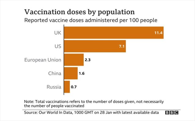 Δυστυχώς μια άλλη αλήθεια, είναι ακόμα πιο οδυνηρή: ότι ο προγραμματισμός του εμβολιασμού των λαών της Ευρωπαϊκής Ενωσης έχει εκτροχιαστεί και ότι η ήδη καθυστερημένη σε αυτό το ζήτημα Ενωση –με 2,3% εμβολιασθέντων, έναντι 11,4% της Βρετανίας, 7,1% των ΗΠΑ και 43% (!) του Ισραήλ– θα βρεθεί με μία ακόμα μεγαλύτερη καθυστέρηση.