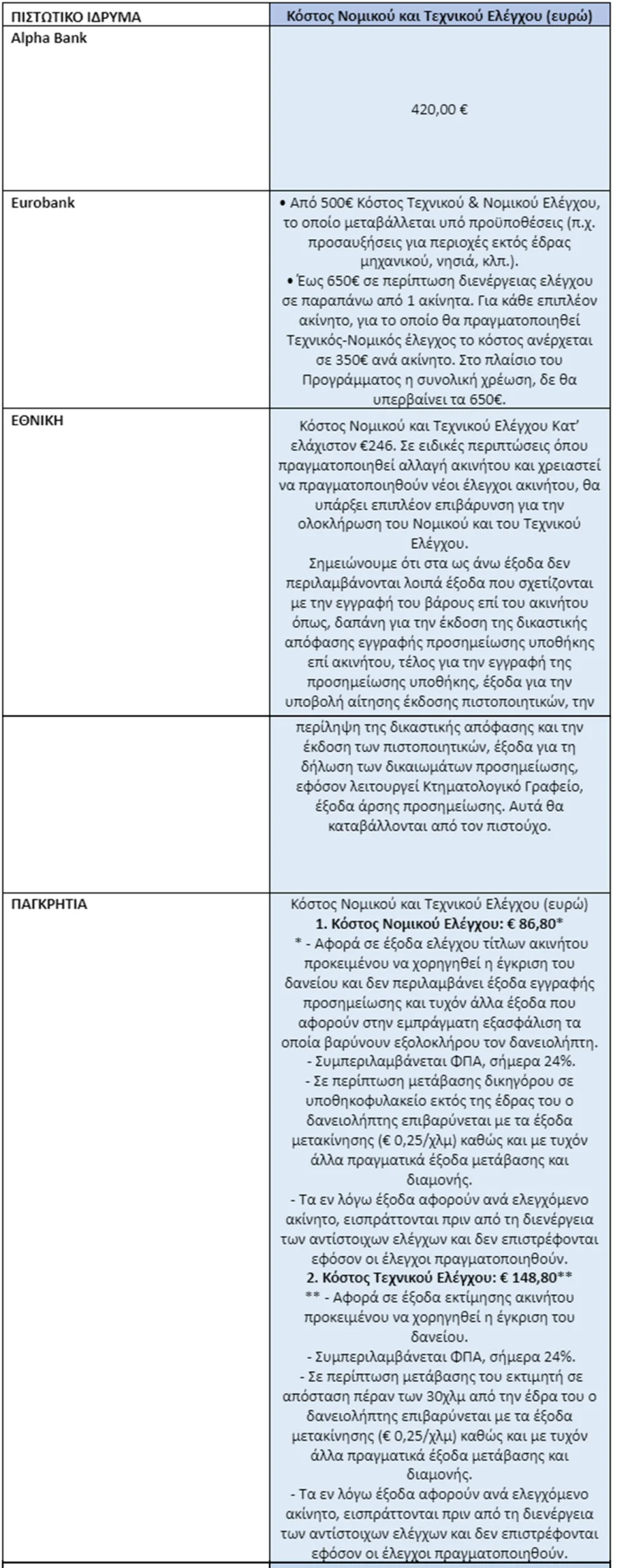 - Τα έξοδα νομικού και τεχνικού ελέγχου για την αγορά του βαρύνουν τον δανειολήπτη και αποτυπώνονται στον πίνακα που ακολουθεί: