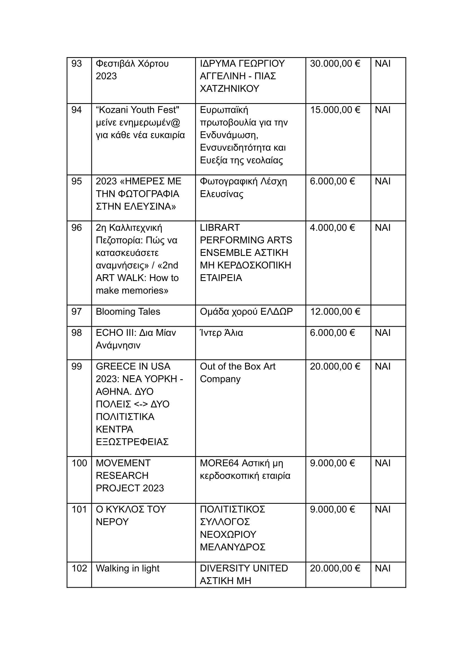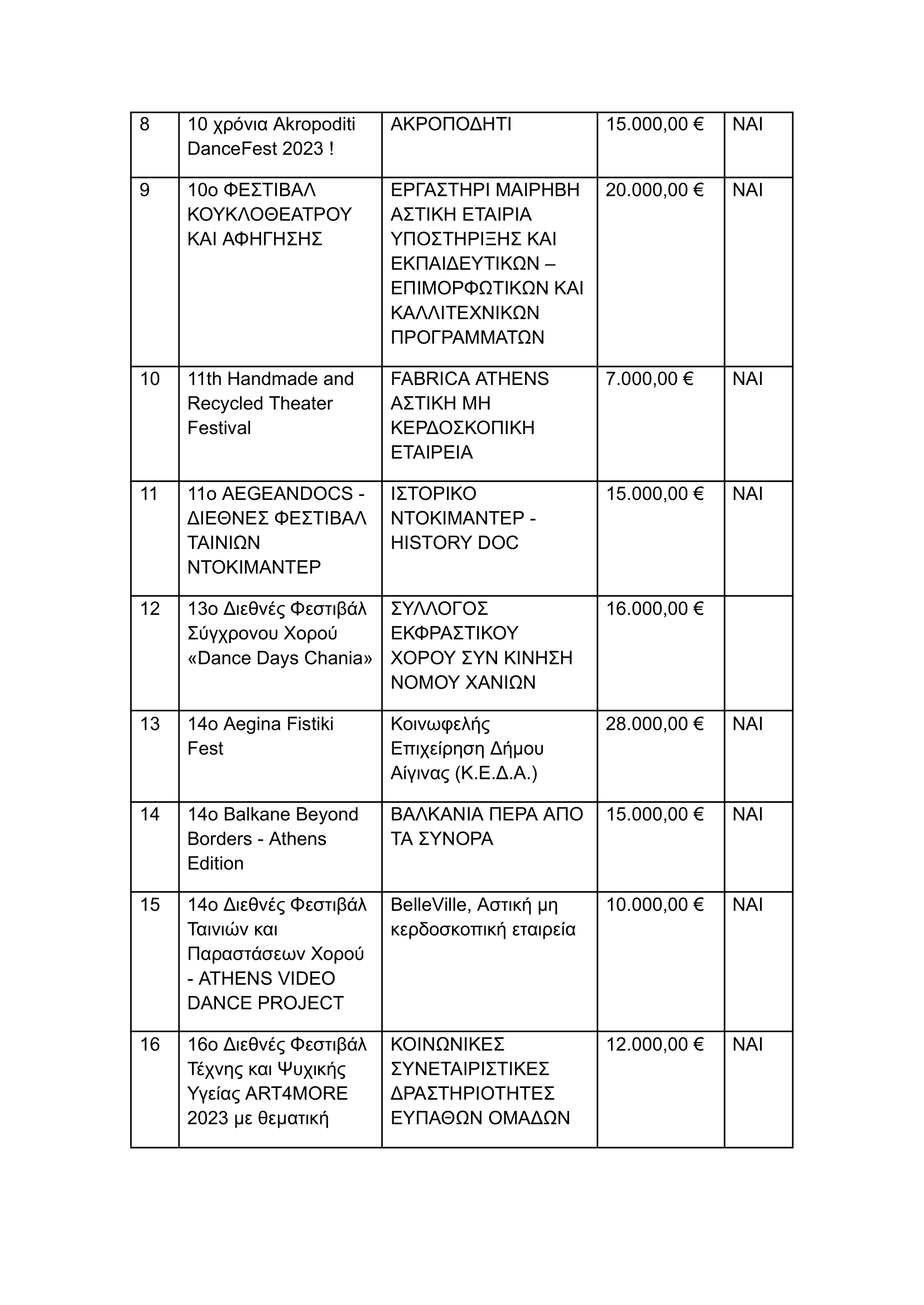 Επισυνάπτεται ο ο πίνακας με τα ποσά επιχορήγησης ή/και παροχή αιγίδας