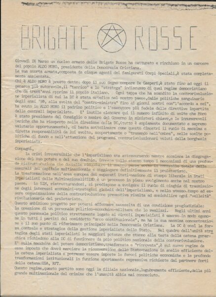 Με τη χαρακτηριστική γραμματοσειρά της οργάνωσης και το αστέρι μέσα σε έναν κύκλο, στην προκήρυξη αναγράφεται, μεταξύ άλλων: «Πέμπτη 16 Μαρτίου ένας οπλισμένος πυρήνας των Ερυθρών Ταξιαρχιών απήγαγε και φυλάκισε σε μία φυλακή του λαού τον ΑΛΝΤΟ ΜΟΡΟ, πρόεδρο των Χριστιανοδημοκρατών»