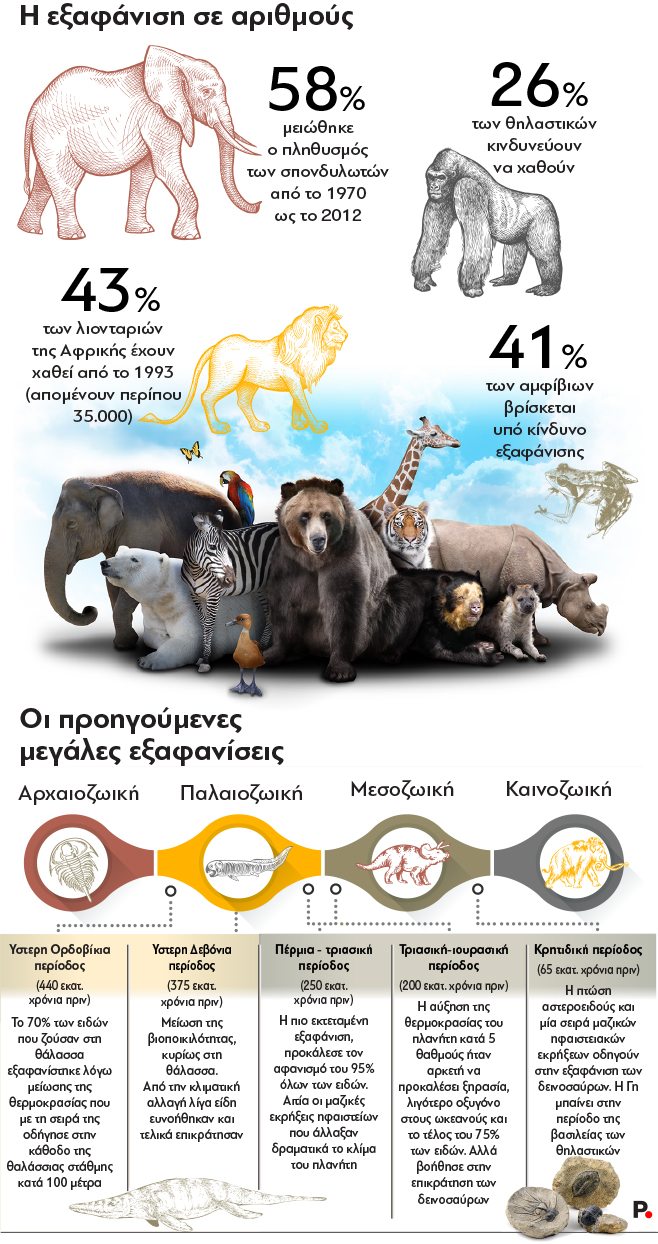 Κάπως έτσι, εν μέσω γενικής αδιαφορίας, ανεπαισθήτως εισήλθαμε στην περίοδο της έκτης μαζικής εξαφάνισης των ειδών, κατά την εκτίμηση τριών βιολόγων του Πανεπιστημίου του Στάντφορντ και του Εθνικού Αυτόνομου Πανεπιστημίου του Μεξικού. Μία βιολογική εξόντωση που δεν αφορά μόνο τα ζώα αλλά απειλεί τα «θεμέλια του ανθρώπινου πολιτισμού» όπως αναφέρουν στη μελέτη τους στην οποία αναφέρεται η ιταλική εφημερίδα «La Repubblica».