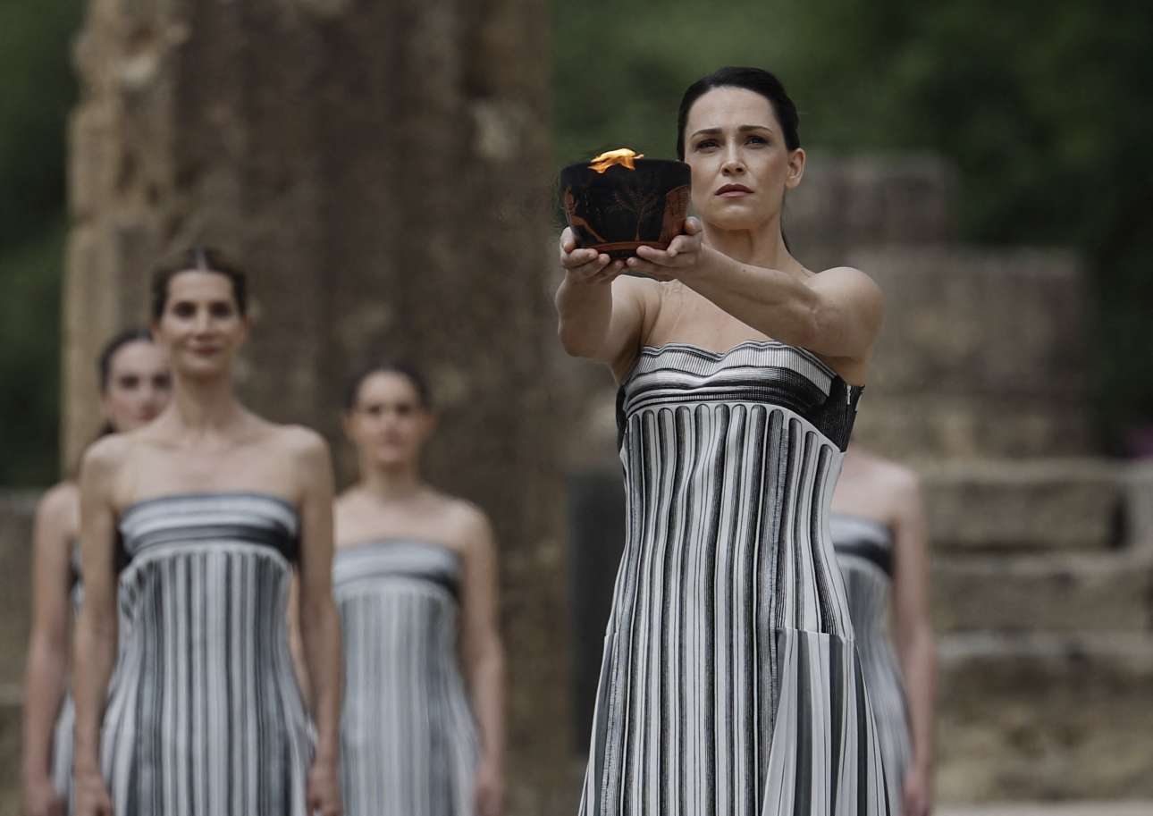 Σε μια επιβλητική τελετή στην Αρχαία Ολυμπία, παρουσία πλήθους κόσμου, η Πρωθιέρεια Μαίρη Μηνά (φωτογραφία κάτω) άναψε, με επίκληση στον θεό Απόλλωνα (και τη βοήθεια –ελλείψει ηλίου– της εφεδρικής Φλόγας από τη γενική πρόβα της Δευτέρας) τη δάδα της Ολυμπιακής Φλόγας για τους Αγώνες στο Παρίσι (26 Ιουλίου – 11 Αυγούστου 2024).