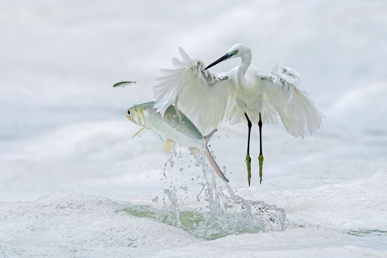 «Πέρασμα», Σιαμέν, Κίνα. Η πόλη Σιαμέν αποκαλείται και «νησί των τσικνιάδων» επειδή φιλοξενεί χιλιάδες τσικνιάδες. Ο οικολόγος Λιν Σιάοπινγκ είναι ειδικευμένος στη φωτογράφιση πουλιών· η πρώτη του εντύπωση για αυτή την εικόνα ήταν ότι επρόκειτο για την απλή φωτογραφία ενός τσικνιά που κάνει ένα άλμα-έκπληξη προς το μελλοντικό του γεύμα. Παρατηρώντας την όμως καλύτερα βλέπει κανείς ότι το... γεύμα κυνηγά επίσης το δικό του γεύμα!