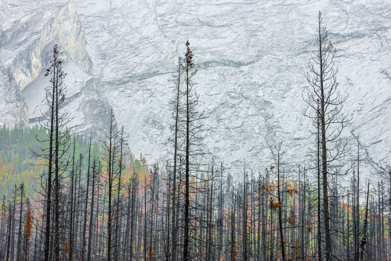 «Αναγέννηση», Εθνικό Πάρκο Τζάσπερ, Αλμπέρτα, Καναδάς. Το 2015, μια πυρκαγιά στο Εθνικό Πάρκο Τζάσπερ έκαψε χιλιάδες στρέμματα και οδήγησε στην απομάκρυνση περίπου 100 ανθρώπων· μήνες αργότερα, ο καταλανός φωτογράφος Μικέλ Αντζέλ Αρτούς Ιλάνα επισκέφθηκε την τοποθεσία και εντυπωσιάστηκε από την ανθεκτικότητα της περιοχής. Η βραχώδης βάση της πλαγιάς δίνει την ψευδαίσθηση ότι τα έλατα εξακολουθούν να φλέγονται, αλλά το πλούσιο νέο φύλλωμα διαβεβαιώνει ότι είναι ένα πάρκο σε φάση ανάκαμψης.(Για πόσο καιρό, όμως;)