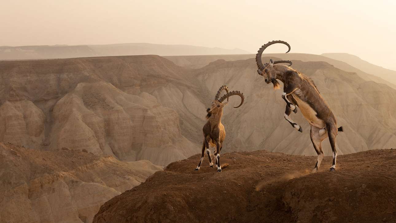 «Ζώντας στα άκρα», Ερημος Ζιν, Ισραήλ. Καθώς έχουν απομείνει λιγότερα από 5.000 αγριοκάτσικα της Νουβίας (Capra nubiana) στον κόσμο, η εύρεση ενός τέτοιου αποτελεί πρόκληση, πόσο μάλλον όταν πρόκειται για πάλη ενήλικων αρσενικών. O φωτογράφος Αμίτ Εσέλ έχει δει πολλά ανήλικα να χτυπούν τα κεφάλια τους ως πρακτική, αλλά πριν από αυτή τη στιγμή δεν είχε δει ποτέ ενήλικα αρσενικά να μάχονται δυνατά για το δικαίωμα αναπαραγωγής