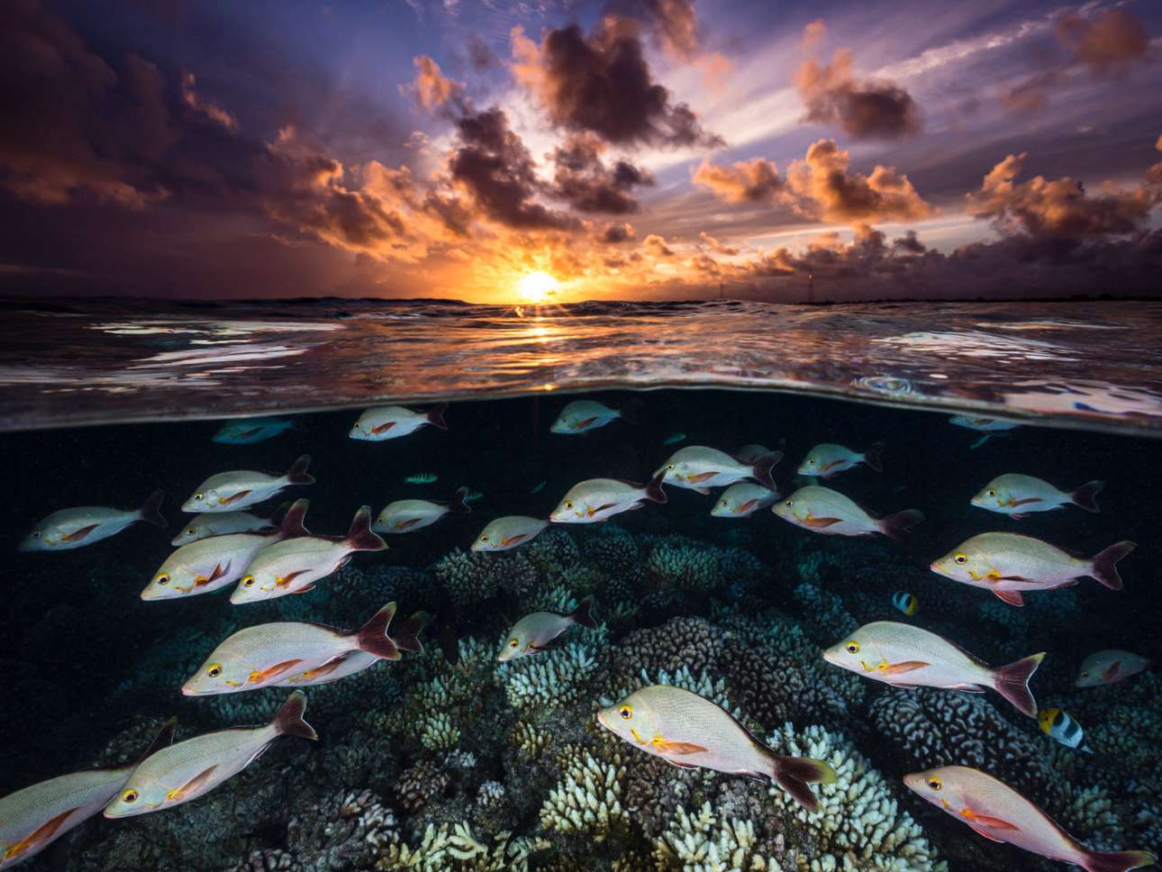 «Κοκκινόψαρα το ηλιοβασίλεμα», Ρανγκιρόα, Γαλλική Πολυνησία. Γαλήνια στιγμή, με κοκκινόψαρα (Lutjanus gibbus) να κολυμπούν στη μεγαλύτερη ατόλη των νησιών Τουαμότου, αυτή η αριστοτεχνική εικόνα αποτυπώνει τα πολλά στρώματα ενός υγιούς, ακμάζοντος οικοσυστήματος -πάνω και κάτω από την επιφάνεια- σε ένα μόνο πλαίσιο. Η φωτογραφία της Ρενέ Καποτσόλα δεν είναι μόνο μια απόδειξη της ομορφιάς του ωκεανού, αλλά και ένα ισχυρό παράδειγμα του πώς μοιάζει ο υδάτινος κόσμος μας όταν προστατεύεται