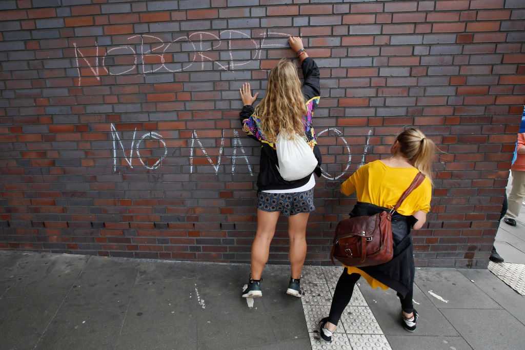 Κάτι σαν το «Imagine» του Τζον Λένον. «Οχι σύνορα, όχι έθνη» γράφουν οι δύο διαδηλώτριες σε έναν τοίχο στο Αμβούργο