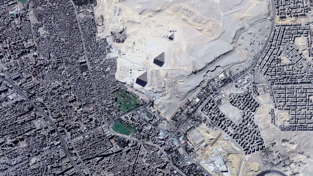 Γκίζα, η πλέον τουριστική περιοχή της Αιγύπτου: διακρίνονται οι τρεις πυραμίδες και μέρος της πόλης η οποία πια έχει ενωθεί με το Κάιρο