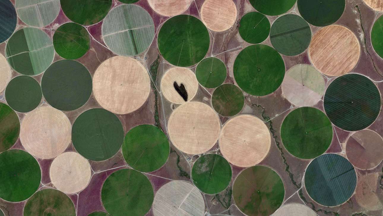 Εξαιρετικής δύναμης εικόνες του Google Earth, από το The Atlantic, σε σταθερή κλίμακα: 5,6 χιλιόμετρα το πλάτος, 3,2 χιλιόμετρα το ύψος, 18,1 τετραγωνικά χιλιόμετρα η καλυπτόμενη από τον φακό έκταση. Ολες οι φωτογραφίες δείχνουν την ενότητα των αντιθέτων επί Γης: το αστικό περιβάλλον και τον φυσικό αντίποδά του, το ασφυκτικό πλήθος και την αποπνικτική ερημία, το τσιμέντο και τη βλάστηση, την καλλιέργεια και τον βράχο, το νερό και τον πάγο.