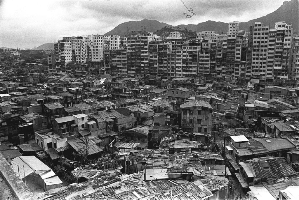 Ασπρόμαυρη άποψη της αδιανόητα πυκνοκατοικημένης Kowloon Walled City, στο Χονγκ Κονγκ. Από τον Ιούνιο του 1974