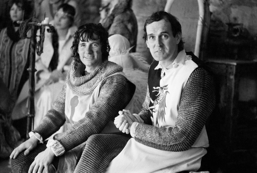 21 Μαΐου 1974: O Μάικλ Πέιλιν (αριστερά) και ο Τζον Κλιζ, μέλη του βρετανικής κωμικής ομάδας Monty Python, ντυμένοι και πανέτοιμοι για δράση. Από τα γυρίσματα της ταινίας «Monty Python and the Holy Grail» (ελληνιστί... «Οι Ιππότες της Ελεεινής Τραπέζης») με θέμα τον θρύλο του βασιλιά Αρθούρου