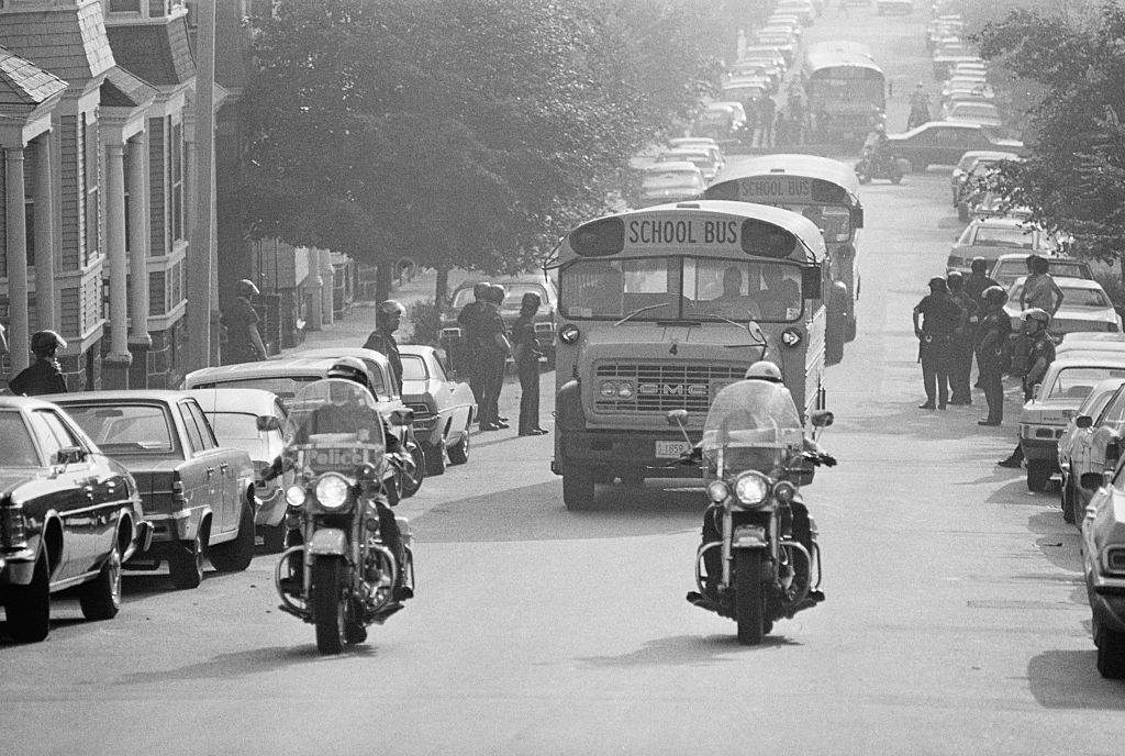 Aστυνομικές δυνάμεις συνοδεύουν σχολικά λεωφορεία σε δρόμο της Βοστώνης, τα οποία μεταφέρουν λευκούς και μαύρους μαθητές, μετά από σχετική δικαστική απόφαση ώστε να προληφθούν οι αντιδράσεις για τη λειτουργία φυλετικά μικτών σχολείων στην πόλη