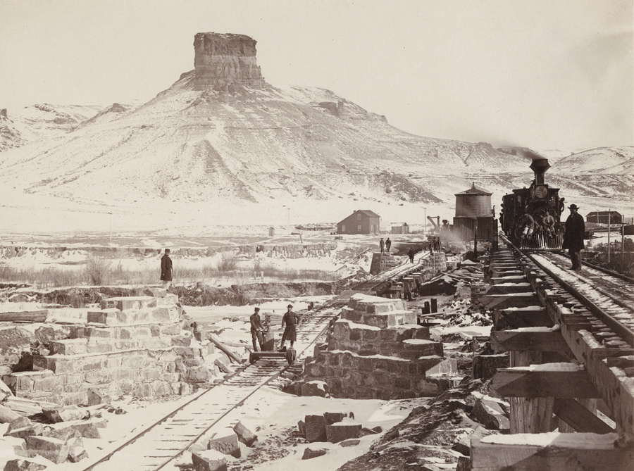 Προσωρινές και μόνιμες γραμμές του Σιδηρόδρομου του Ειρηνικού στη βάση του βράχου Citadel στο Γουαϊόμινγκ
