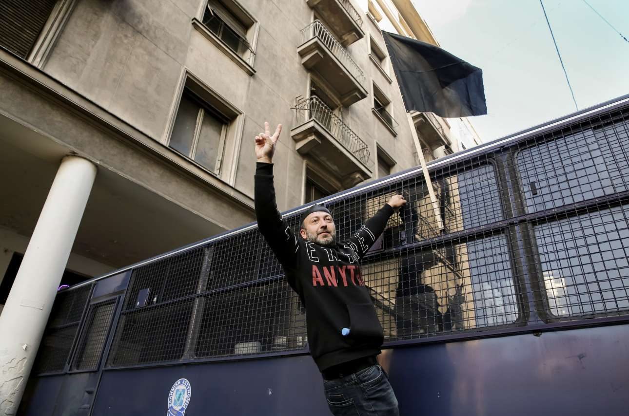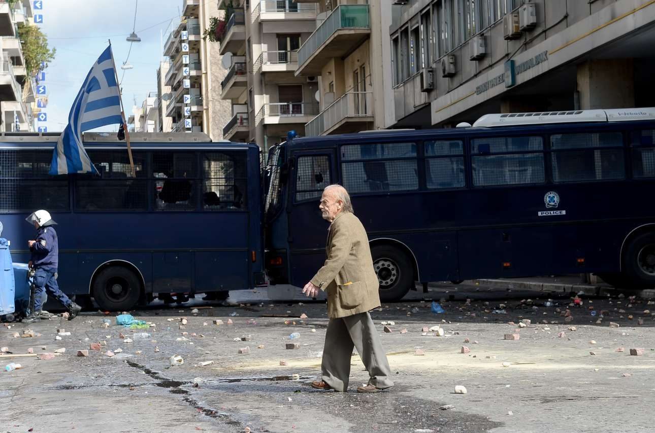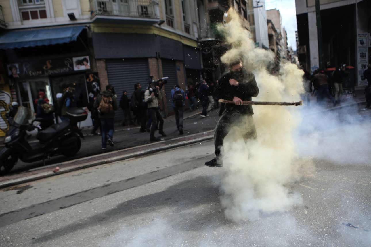 Σκηνές σκληρού ροκ. Δύο άνδρες των ΜΑΤ σέρνουν από τα ρούχα κάποιον διαδηλωτή ενώ δέχονται τα χτυπήματα από άλλους