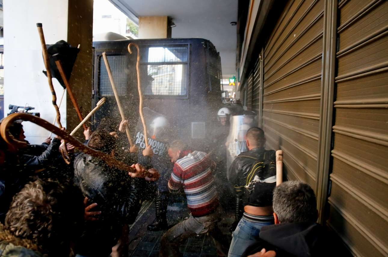 Κρητικοί αγρότες εναντίον ΜΑΤ. Αν και ο τύπος δεξιά, με τα λευκά Stan Smith, αθλητική φόρμα, γυαλί ηλίου και σακίδιο δεν είναι αυτό που θα έλεγε κανείς αρχετυπικός Κρητικός