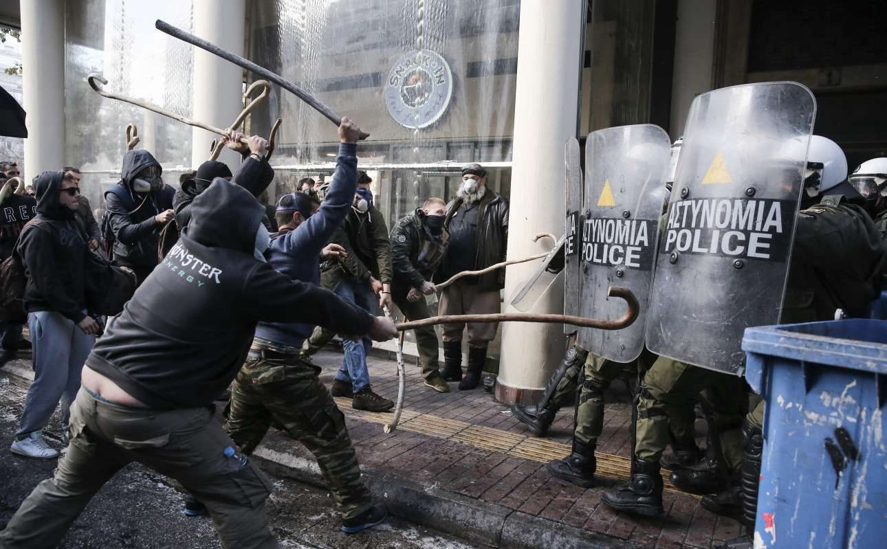 Μαγκούρα εναντίον γκλομπ, τούβλο εναντίον δακρυγόνου, κρητικοί αγρότες εναντίον ΜΑΤ: ήταν λίγο πολύ το σκηνικό που στήθηκε από νωρίς έξω από το υπουργείο Αγροτικής Ανάπτυξης στην πλατεία Βάθη. Ολα ξεκίνησαν μόλις οι αγρότες (οι περισσότεροι είναι από την Κρήτη) έφτασαν στο υπουργείο για να διαμαρτυρηθούν για το Ασφαλιστικό και διαπίστωσαν πως η ΕΛ.ΑΣ. είχε φράξει την είσοδο με κλούβες. Τα υπόλοιπα σε εικόνες…